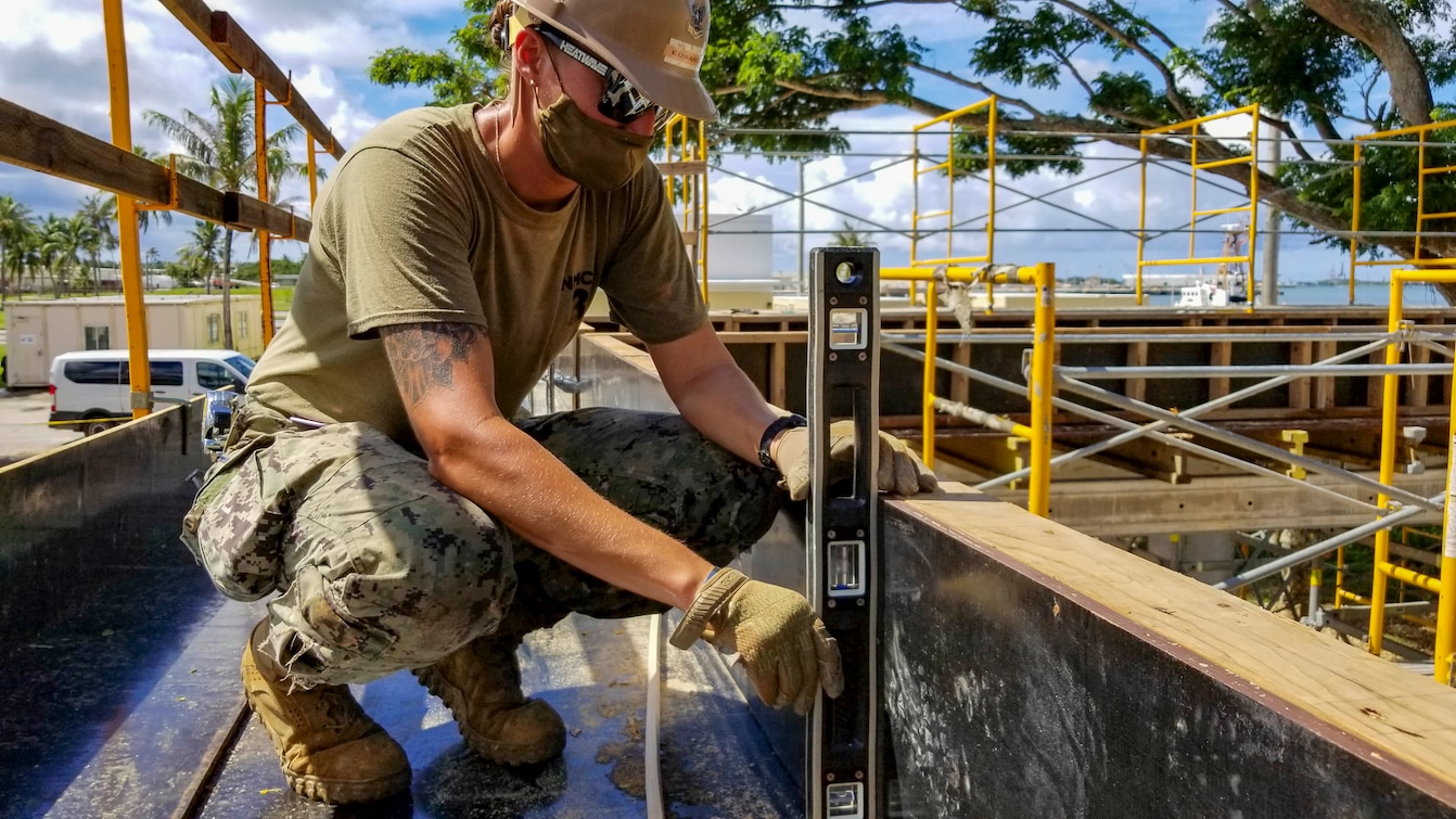 SANTA RITA, Guam (Sept. 18, 2020) Builder 2nd Class Sierra Edwards, from Glenwood, Iowa, assigned to U.S. Naval Mobile Construction Battalion (NMCB) 3�s Detail Guam, ensures formwork for roof beams are plumb for a concrete pavilion project in support of the U.S. Coast Guard. NMCB-3 is deployed across the Indo-Pacific region conducting high-quality construction to support U.S. and partner nations to strengthen partnerships, deter aggression, and enable expeditionary logistics and naval power projection. The battalion stands ready to complete assigned tasking, support Humanitarian Aid/Disaster Relief and Major Combat Operations throughout the area of responsibility. (U.S. Navy photo by Equipment Operator 2nd Class Monica Cervantes)