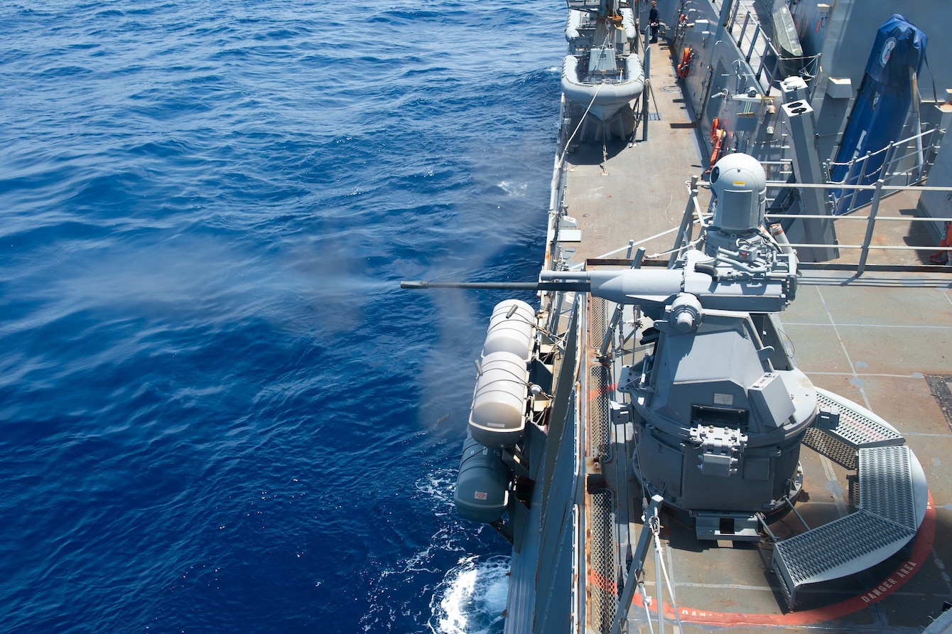 CARIBBEAN SEA (Sept. 21, 2020) The Arleigh-Burke class guided-missile destroyer USS William P. Lawrence (DDG 110) fires an Mk 38 25mm machine gun during a live-fire exercise. William P. Lawrence is deployed to the U.S. 4th Fleet area of operations to support Joint Interagency Task Force South's mission, which includes counter illicit drug trafficking in the Caribbean Sea and eastern Pacific Ocean. (U.S. Navy photo by Mass Communication Specialist 3rd Class Maria G. Llanos)