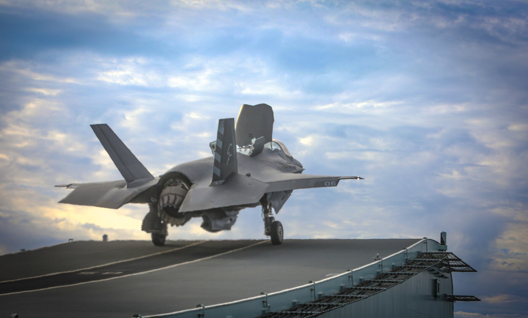 NORTH SEA (Sept. 28, 2020) U.S. Marine Corps Capt. Chris Streicher with Marine Fighter Attack Squadron (VMFA) 211, launches from the deck of the British Royal Navy aircraft carrier HMS Queen Elizabeth (R08) armed with a Gun Pod Unit (GPU) - 9/A, at sea, September 28, 2020. Streicher became the second F-35B Joint Strike Fighter pilot to fly from the deck of Queen Elizabeth while carrying a GPU. This milestone continues VMFA-211's preparation for the United Kingdom's Carrier Strike Group global deployment. (U.S. Marine Corps photo by 1st Lt. Zachary Bodner)