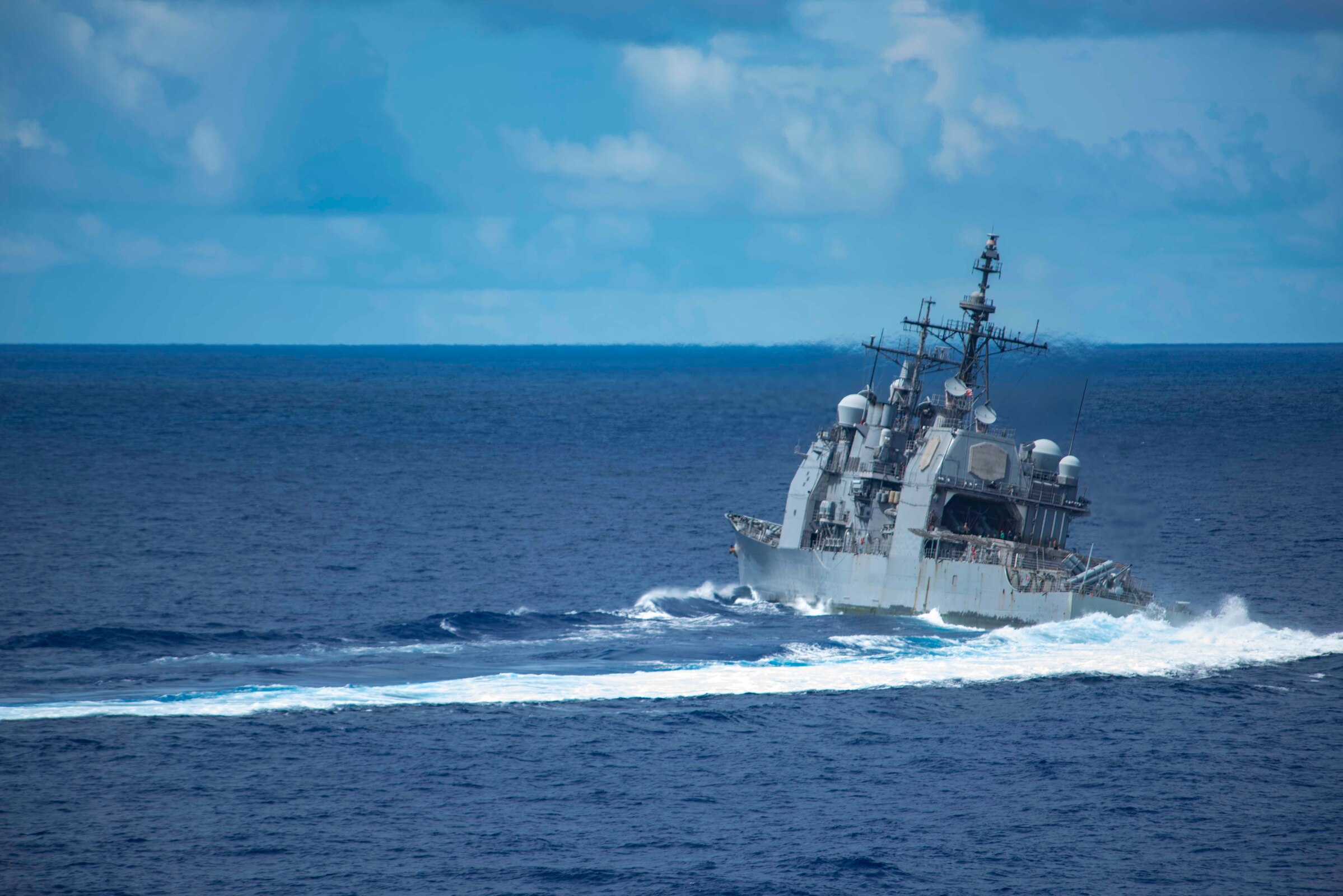 PHILIPPINE SEA (Sept. 29, 2020) The guided-missile cruiser USS Antietam (CG 54) steams ahead during an air power demonstration, showcasing firepower capability and maneuverability while at sea in the Indo-Pacific region. Events included formation flybys, high-speed aerial turns and rocket shoots by aircraft attached to Carrier Air Wing (CVW) 5, and a 5-inch gun shoot from Antietam. CVW-5 is currently embarked on the Navy’s only forward-deployed aircraft carrier USS Ronald Reagan (CVN 76). Ronald Reagan, the flagship of Carrier Strike Group 5, provides a combat-ready force that protects and defends the United Sates, as well as the collective maritime interests of its allies and partners in the Indo-Pacific region. (U.S. Navy photo by Mass Communication Specialist 3rd Class Quinton A. Lee)