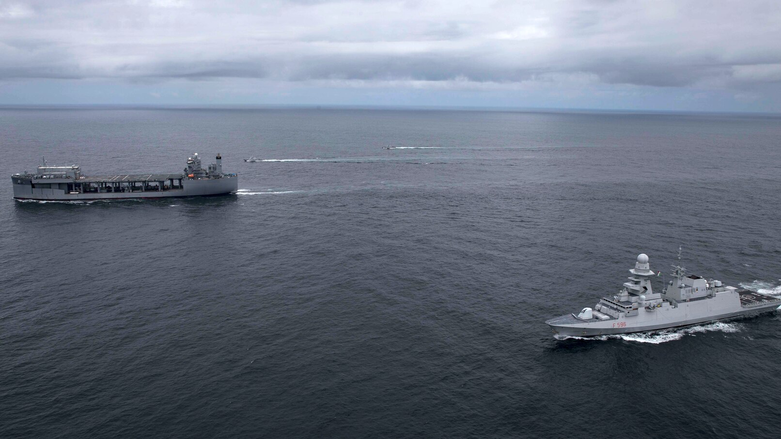 GULF OF GUINEA (Sept. 26, 2020) The expeditionary sea base USS Hershel “Woody” Williams (ESB 4), right center, conducts a tracking exercise with Ivorian navy ships OPV C.F. Sekongo and OPV L’Emergence and Italian navy frigate ITS Federico Martinengo (F 596), right, in the Gulf of Guinea, Sept. 26, 2020. Hershel “Woody” Williams is on its inaugural deployment in the U.S. Naval Forces Europe-Africa area of responsibility in support of maritime missions and special operations. (U.S. Marine Corps photo by Sgt. Megan Roses)
