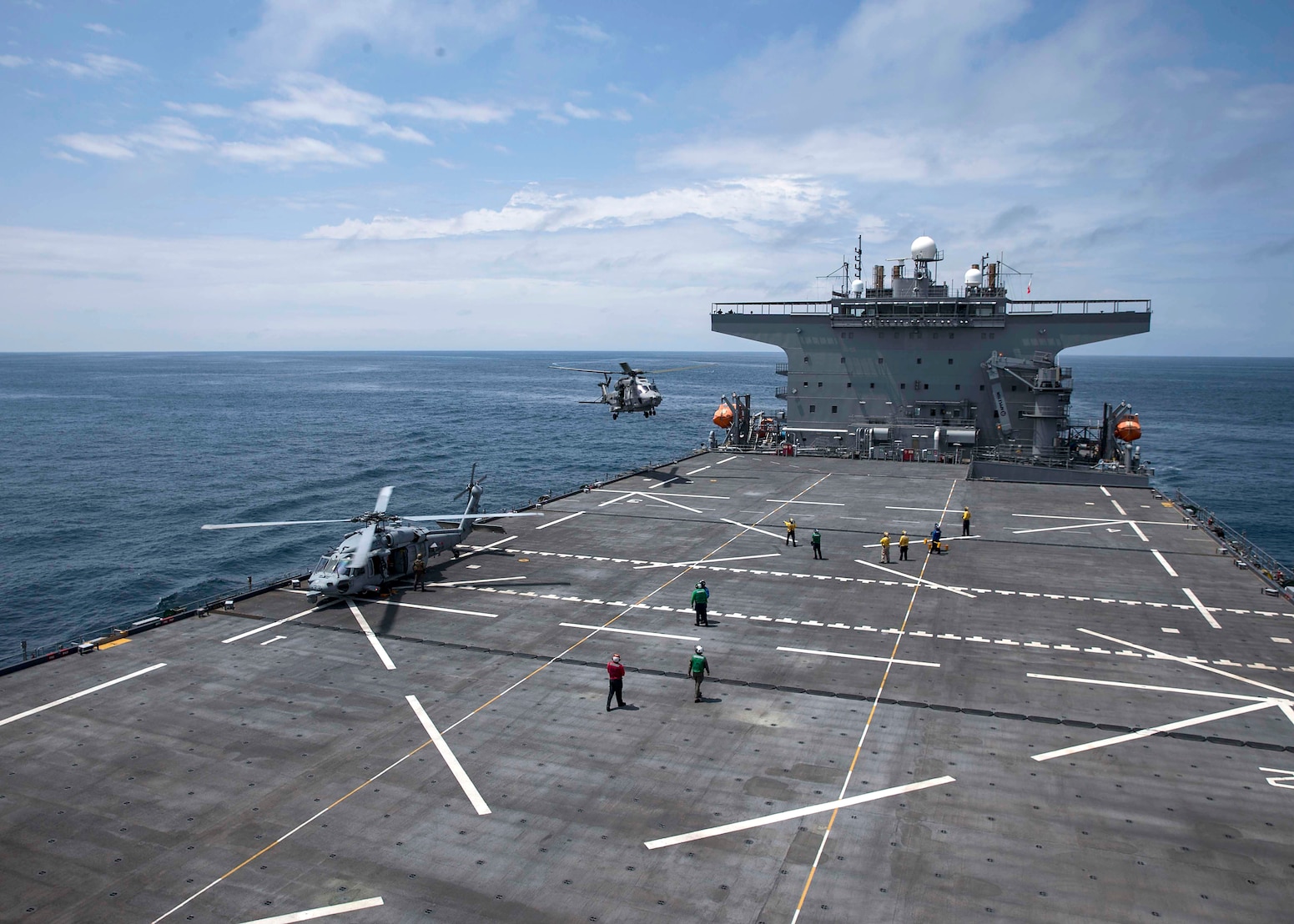 GULF OF GUINEA (Sept. 28, 2020) A U.S. Navy MH-60S Seahawk helicopter assigned to the “Ghost Riders” of Helicopter Sea Combat Squadron (HSC) 28, front, and an Italian NH 90 helicopter land on the expeditionary sea base Hershel “Woody” Williams (ESB 4) during a tracking exercise with Italian navy frigate ITS Federico Martinengo (F 596) and the Ghana navy Snake-class patrol vessel Ehwor (P 37) in the Gulf of Guinea, Sept. 28, 2020. Hershel “Woody” Williams is on its inaugural deployment in the U.S. Naval Forces Europe-Africa area of responsibility in support of maritime missions and special operations. (U.S. Marine Corps photo by Sgt. Megan Roses)