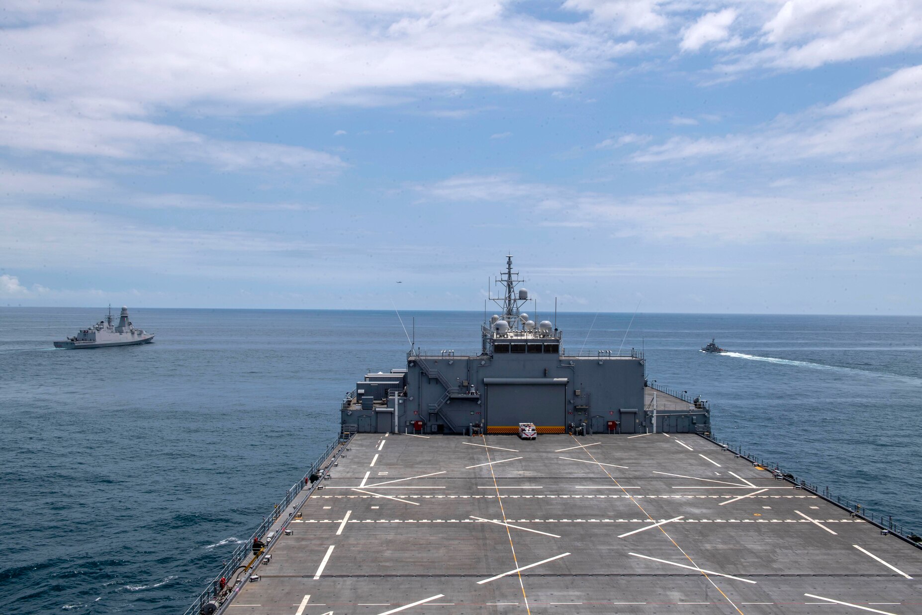 GULF OF GUINEA (Sept. 28, 2020) The Italian navy frigate ITS Federico Martinengo (F 596), left, the expeditionary sea base USS Hershel "Woody" Williams (ESB 4) and, the Ghana navy Snake-class patrol vessel Ehwor (P 37), right, conduct a tracking exercise in the Gulf of Guinea, Sept. 28, 2020. Hershel "Woody" Williams is on its inaugural deployment in the U.S. Naval Forces Europe-Africa area of responsibility in support of maritime missions and special operations. (U.S. Navy photo by Mass Communication Specialist Seaman Conner Foy)