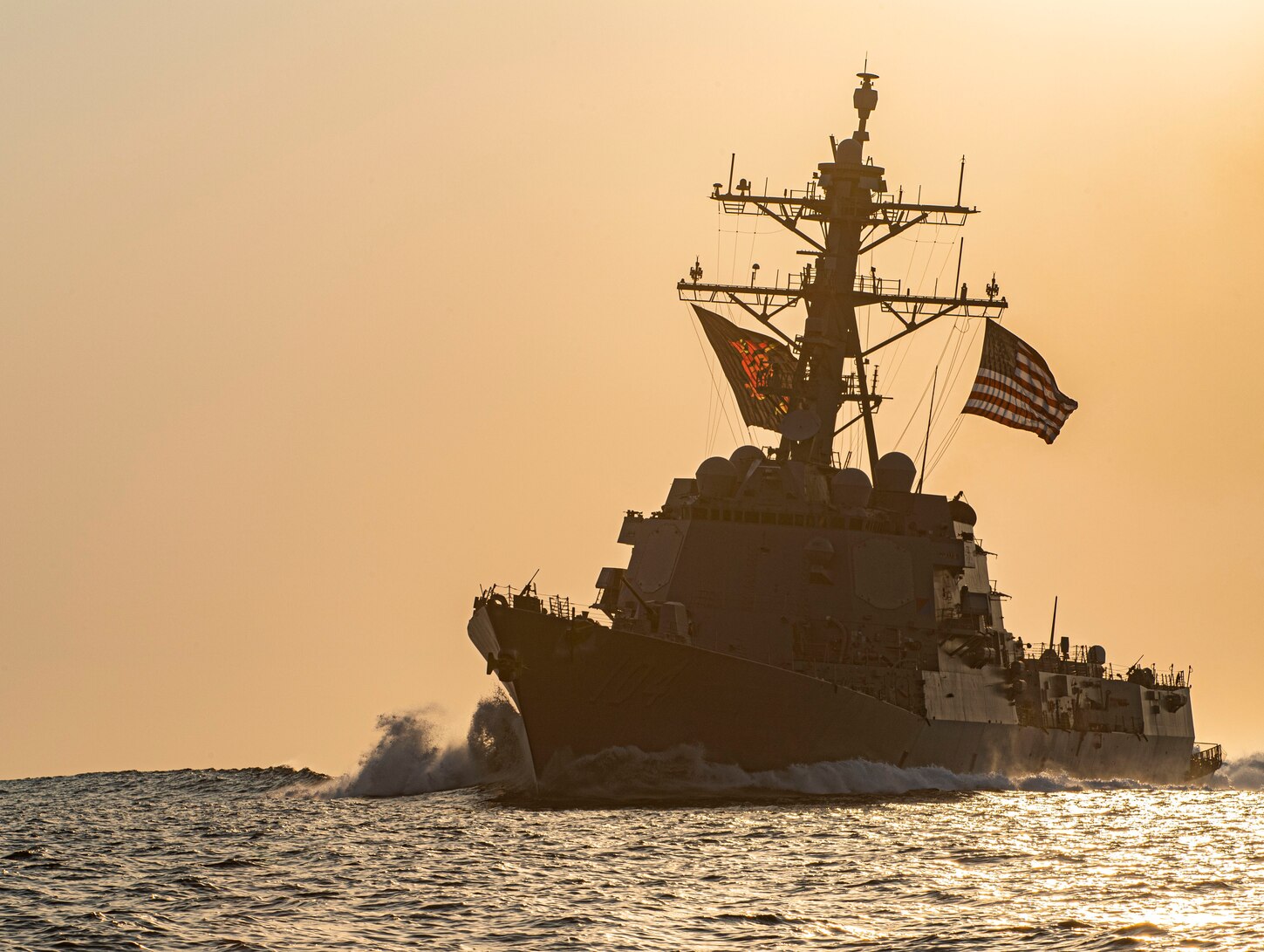 ARABIAN GULF (Sept. 29, 2020) The guided-missile destroyer USS Sterett (DDG 104) steams with its “Battle Ensign” in the Arabian Gulf, Sept. 29, 2020. Sterett is part of the Nimitz Carrier Strike Group and is deployed to the U.S. 5th Fleet area of operations to ensure maritime stability and security in the Central Region, connecting the Mediterranean and Pacific through the western Indian Ocean and three critical chokepoints to the free flow of global commerce. (U.S. Navy photo by Mass Communication Specialist Seaman Drace Wilson)