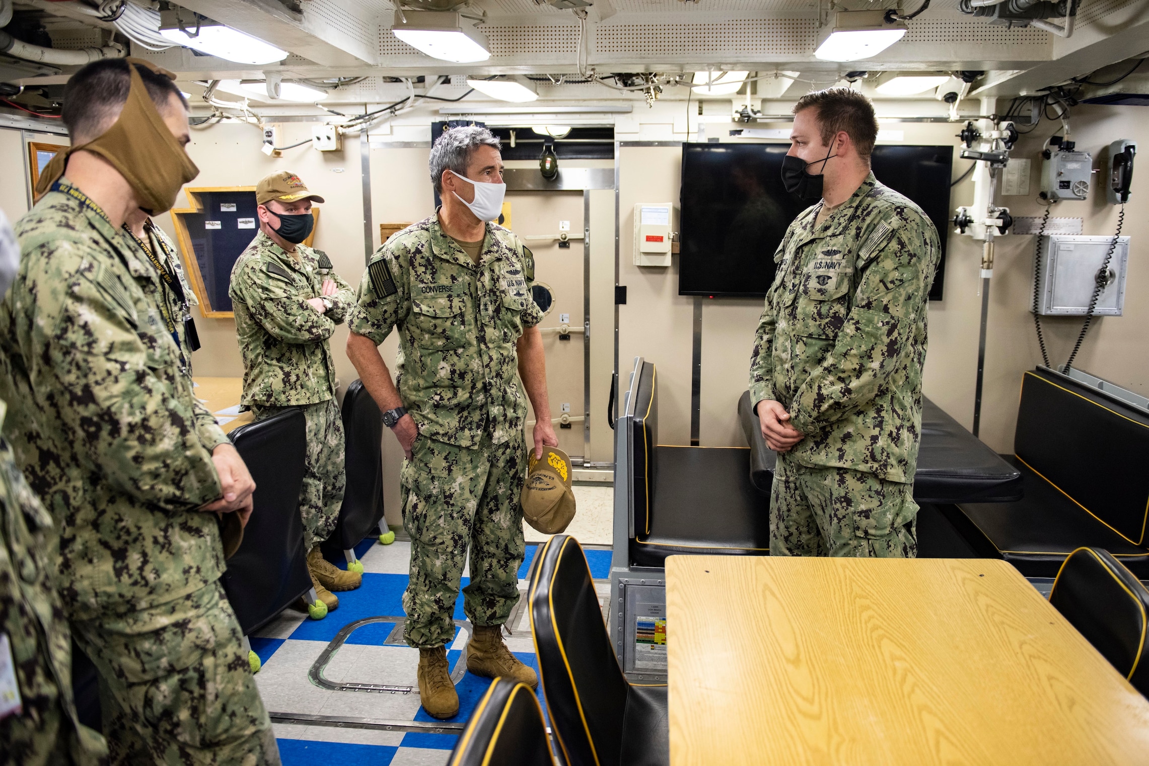 SILVERDALE, Wash. (Sept. 30, 2020) Rear Adm. Blake Converse, commander of Submarine Force, U.S. Pacific Fleet, presents a coin to Sonar Technician (Submarine) 1st Class Paul Andrews, from Corning, California, assigned to the Ohio-class ballistic missile submarine USS Pennsylvania (SSBN 735), Blue crew, for supporting the Gold crew on their previous patrol, Sept. 30, 2020. As the principal advisor to Commander, U.S. Pacific Fleet for submarine matters, Converse visited Commander, Submarine Group 9 and other strategic deterrent units in the Pacific Northwest to see current unit operations and capabilities first-hand. (U.S. Navy photo by Mass Communication Specialist 1st Class Andrea Perez)