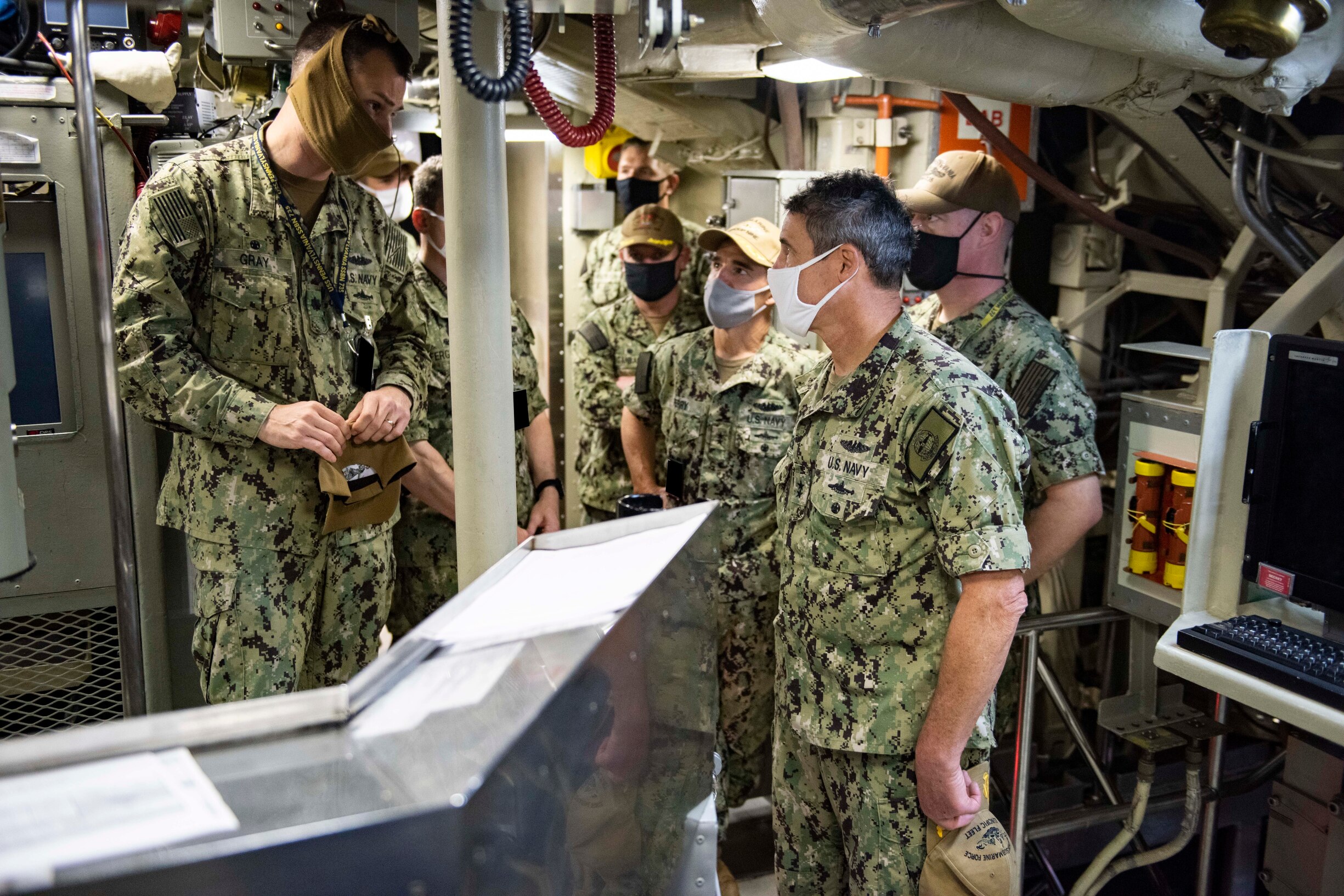 SILVERDALE, Wash. (Sept. 30, 2020) Rear Adm. Blake Converse, commander of Submarine Force, U.S. Pacific Fleet, speaks with Cmdr. Sean Gray, from Nampa, Idaho, commanding officer of the Ohio-class ballistic missile submarine USS Pennsylvania (SSBN 735) Blue crew, during a tour, Sept. 30, 2020. As the principal advisor to Commander, U.S. Pacific Fleet for submarine matters Converse visited Commander, Submarine Group 9 and other strategic deterrent units in the Pacific Northwest to see current unit operations and capabilities first-hand. (U.S. Navy photo by Mass Communication Specialist 1st Class Andrea Perez)