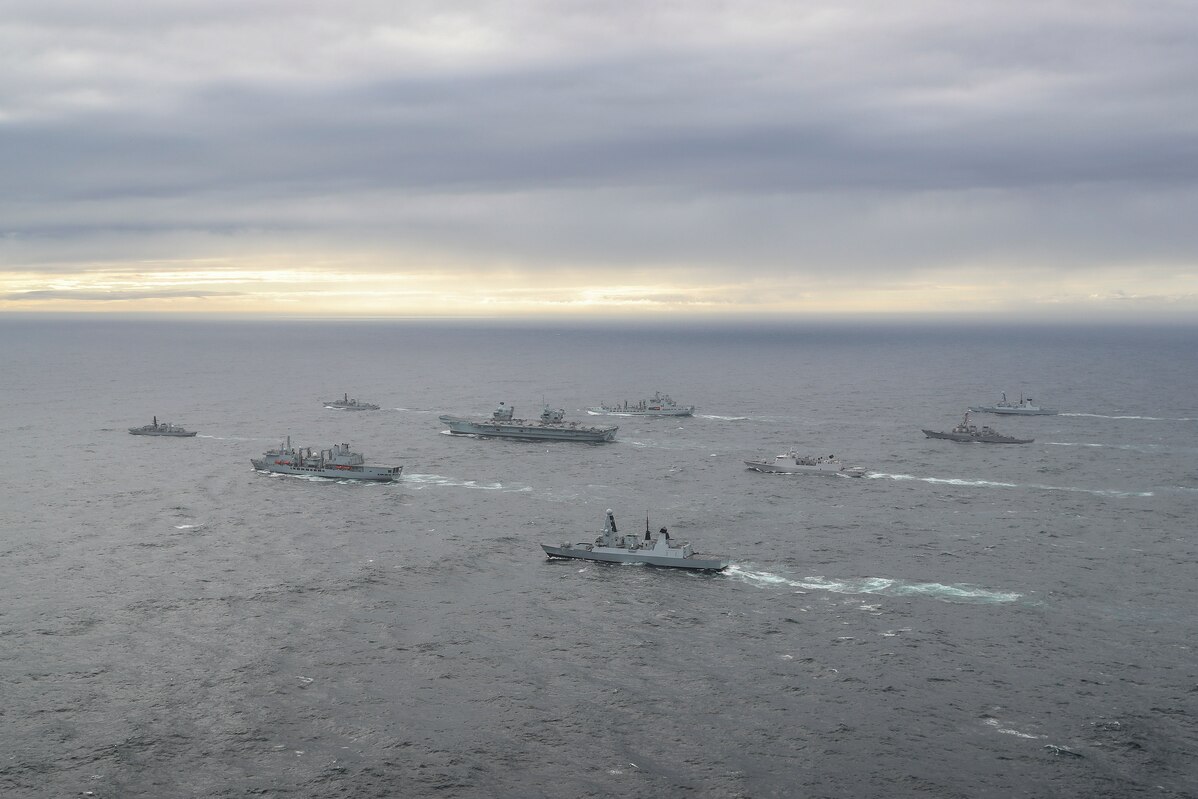 NORTH SEA (Oct. 4, 2020) The full United Kingdom (UK) Carrier Strike Group (CSG) assembled at sea. The CSG is led by the Royal Navy aircraft carrier HMS Queen Elizabeth (R 08) and includes flotilla of destroyers and frigates from the UK, the Netherlands, the U.S. Navy guided-missile destroyer USS The Sullivans (DDG 68), and 15 F-35B Lightning II's from Marine Fighter Attack Squadron 211 and the UK's 617 Squadron. (U.S. Navy photo courtesy of the Royal Navy)