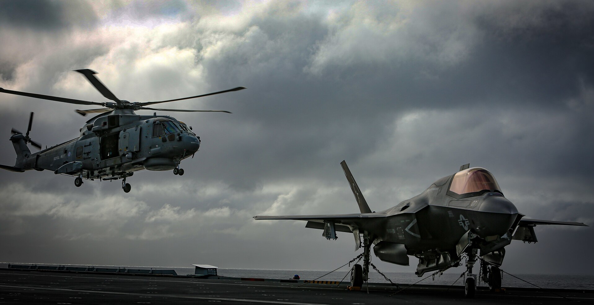 NORTH SEA (Sept. 27, 2020) An F-35B Lightning II Joint Strike Fighter with Marine Fighter Attack Squadron (VMFA) 211 is parked on the flight deck aboard the Royal Navy aircraft carrier HMS Queen Elizabeth (R 08) at sea, Sept. 27, 2020. VMFA-211 is deployed aboard HMS Queen Elizabeth to conduct training with their United Kingdom counterparts in preparation for the UK's Carrier Strike Group deployment this spring. The U.S. Marine Corps is supporting this historic deployment in support of U.S. Marine Corps, Department of Defense, national and allied objectives. (U.S. Marine Corps photo by 1st Lt. Zachary Bodner)