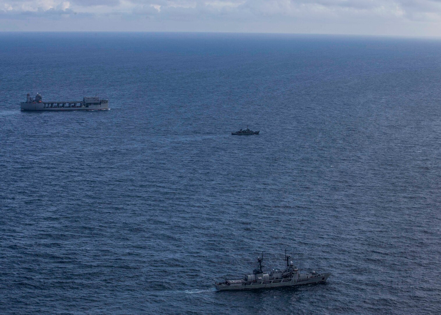 GULF OF GUINEA (Sept. 30, 2020) The Expeditionary Sea Base USS Hershel "Woody" Williams (ESB 4), left, conducts maneuvers during a maneuvering exercise with Nigerian Navy ships NNS Okpabana (F93), front, and NNS Prosperity (P21) , with USS Hershel "Woody" Williams in the Gulf of Guinea, Sept. 30, 2020. Hershel "Woody" Williams is on its inaugural deployment in the U.S. Naval Forces Europe-Africa area of responsibility in support of maritime missions and special operations. (U.S. Marine Corps photo by Sgt. Megan Roses)