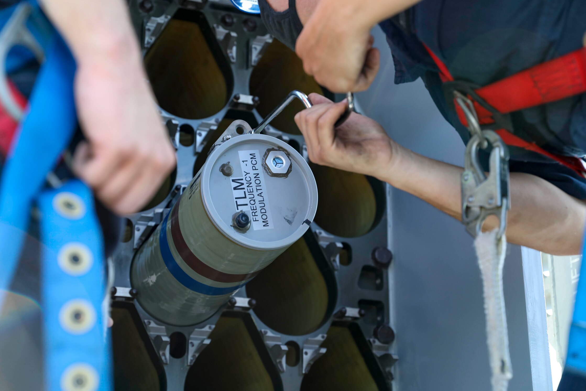 ATLANTIC OCEAN (Oct. 12, 2020) Fire Controlman 2nd Class Vincent Visone, left, and Fire Controlman 2nd Class Joseph Randazzo load a telemetry missile in the RIM-116 Rolling Airframe Missile (RAM) on the forward missile deck aboard the Wasp-class amphibious assault ship USS Iwo Jima (LHD 7) during their Surface Warfare Advanced Tactical Training (SWATT), Oct. 12, 2020. The Iwo Jima Amphibious Ready Group is participating in SWATT off the coast of North Carolina, to maintain readiness, proficiency and lethality. (U.S. Navy photo by Mass Communication Specialist Seaman Larry D. Lockett Jr.)
