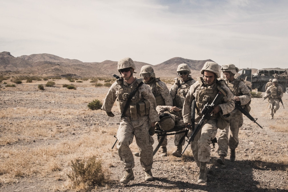 TWENTYNINE PALMS, Calif. (Oct. 23, 2020) U.S. Marines carry a simulated casualty to the landing zone while conducting Advanced Motorized Operators Course during Integrated Training Exercise (ITX) 1-21 at Marine Air Ground Combat Center Twentynine Palms, California, Oct. 23, 2020. Motor vehicle operators with Combat Logistics Battalion 8, Combat Logistics Regiment 2, 2nd Marine Logistics Group are training at ITX as the logistics combat element to provide tactical logistics in the areas of medium and heavy-lift motor transportation beyond 4th Marine Regiment’s organic capabilities. (U.S. Marine Corps photo by Lance Cpl. Zachary Zephir)