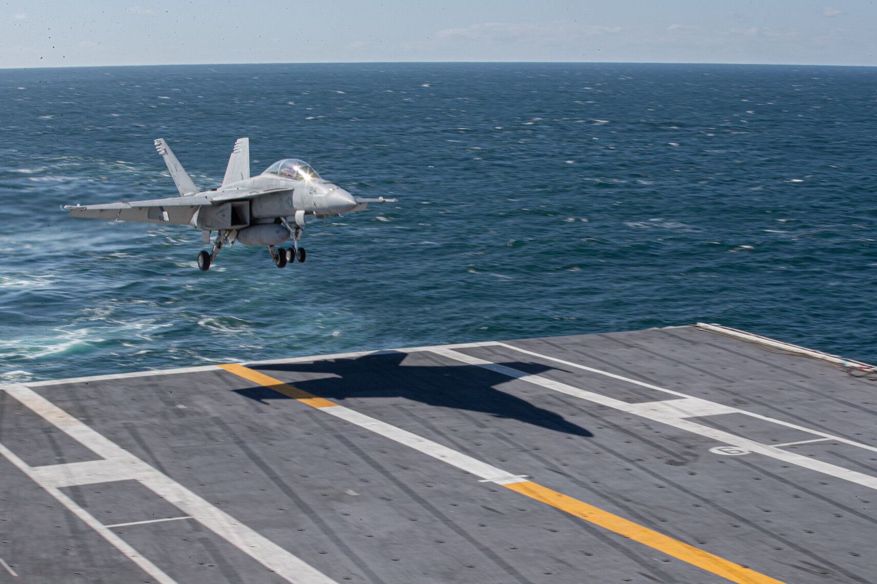 ATLANTIC OCEAN (Oct. 31, 2020) An F/A-18F Super Hornet attached to the “Gladiators” of Strike Fighter Squadron (VFA) 106 approaches to land on the aircraft carrier USS Gerald R. Ford (CVN 78) flight deck, Oct. 31, 2020. Gerald R. Ford is underway in the Atlantic Ocean conducting carrier qualifications. (U.S. Navy photo by Mass Communication Specialist Seaman Apprentice Trenton Edly)