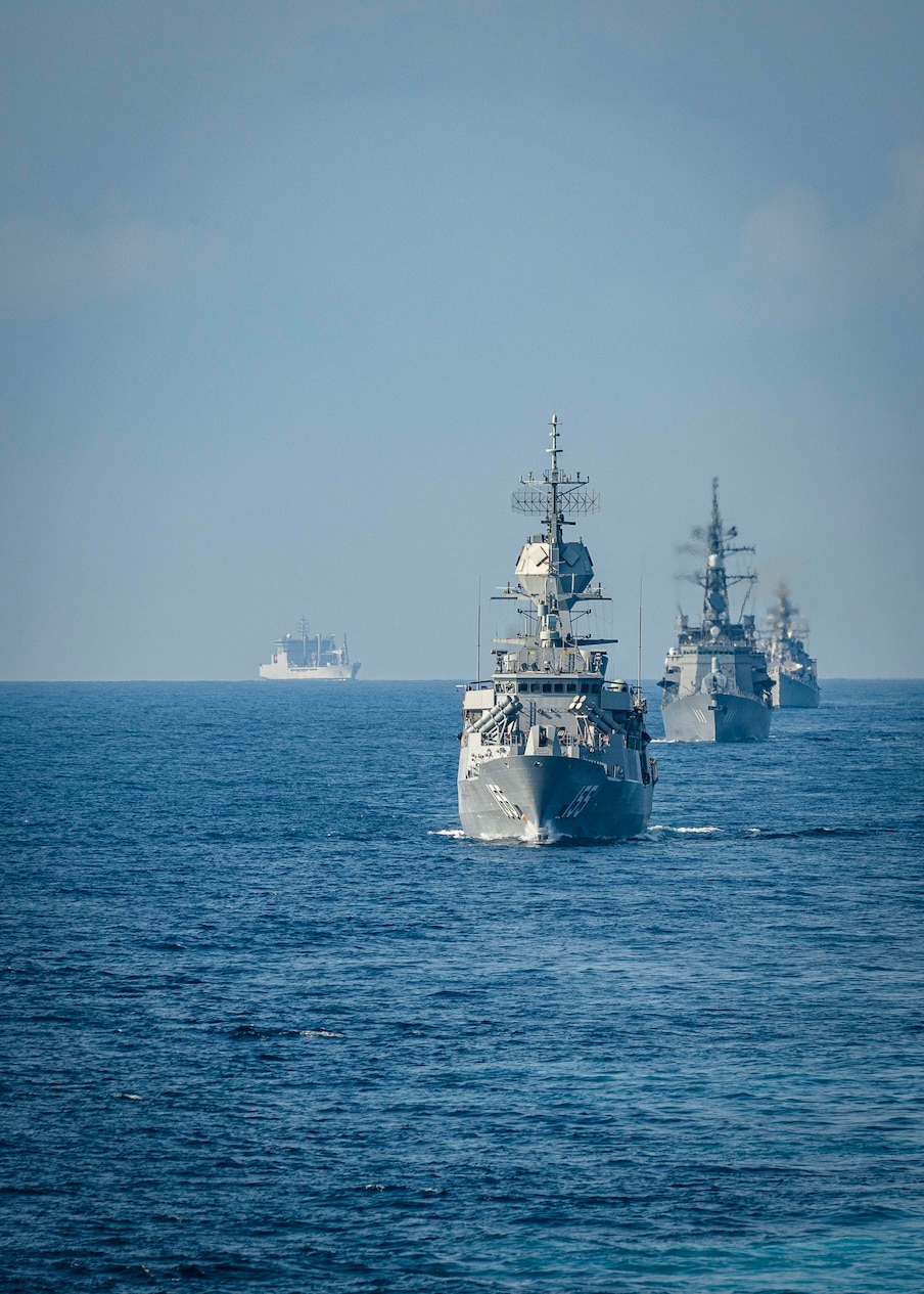 INDIAN OCEAN (Nov. 4, 2020) Ships from multiple nations sail in formation prior to sailing alongside the Indian Navy Sindhughosh-class submarine INS Sindhuraj (S 57) as part of Malabar 2020. Malabar is an India-led multinational exercise designed to enhance cooperation between Indian Navy (IN), Royal Australian Navy (RAN), Japan Maritime Self-Defense Force (JMSDF) and U.S. maritime forces. Australian, Indian, Japanese and American maritime forces routinely operate together in the Indo-Pacific, fostering a cooperative approach toward regional security and stability. (U.S. Navy photo by Mass Communication Specialist 2nd Class Markus Castaneda)