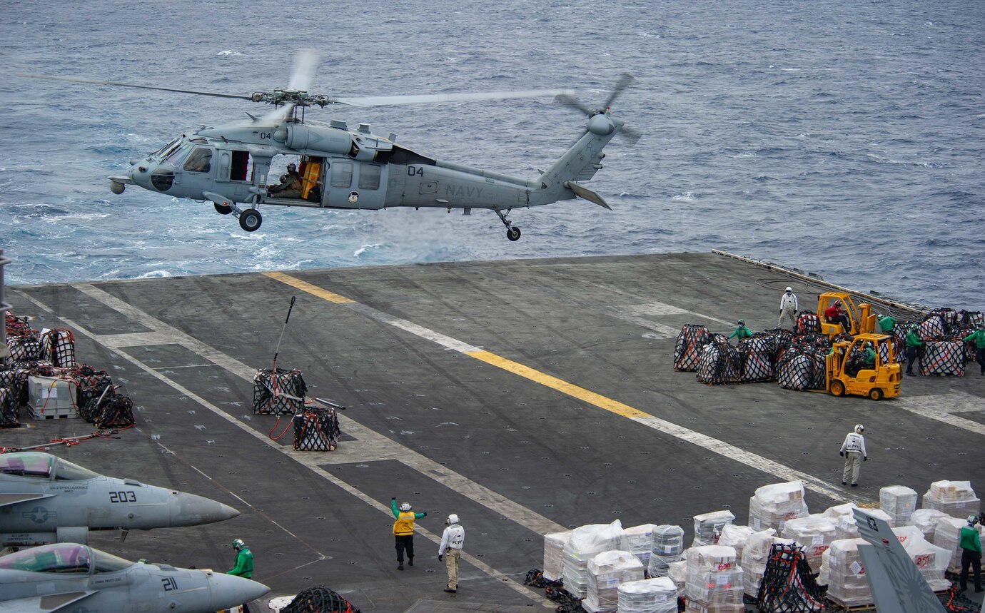 PHILIPPINE SEA (Nov. 5, 2020) An MH-60S Sea Hawk helicopter attached to the Knighthawks of Helicopter Sea Combat Squadron (HSC) 25 delivers supplies on the flight deck of the Navy’s only forward-deployed aircraft carrier USS Ronald Reagan (CVN 76) during a replenishment-at-sea with the dry cargo and ammunition ship USNS Alan Shepard (T-AKE 3). Ronald Reagan, the flagship of Carrier Strike Group 5, provides a combat-ready force that protects and defends the United States, as well as the collective maritime interests of its allies and partners in the Indo-Pacific. (U.S. Navy photo by Mass Communication Specialist Seaman Apprentice Oswald Felix Jr.)