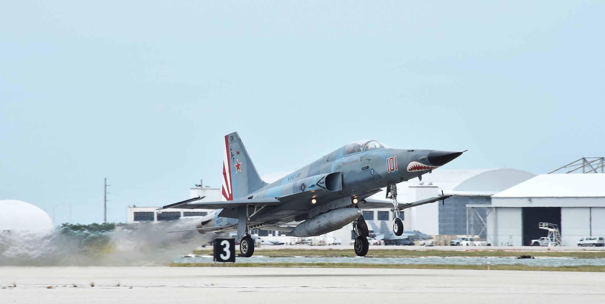 KEY WEST, Fla. (Nov. 6, 2020) An F-5N Tiger-II from the "Sun Downers" of Fighter Squadron Composite (VFC) 111 takes off from Naval Air Station Key West's Boca Chica Field during the last day of training before the potential bad weather resulting from Tropical Storm Eta. Naval Air Station Key West is the state-of-the-art facility for combat fighter aircraft of all military services, provides world-class pierside support to U.S. and foreign naval vessels, and is the premier training center for surface and subsurface military operations. (U.S. Navy photo by Danette Baso Silvers)