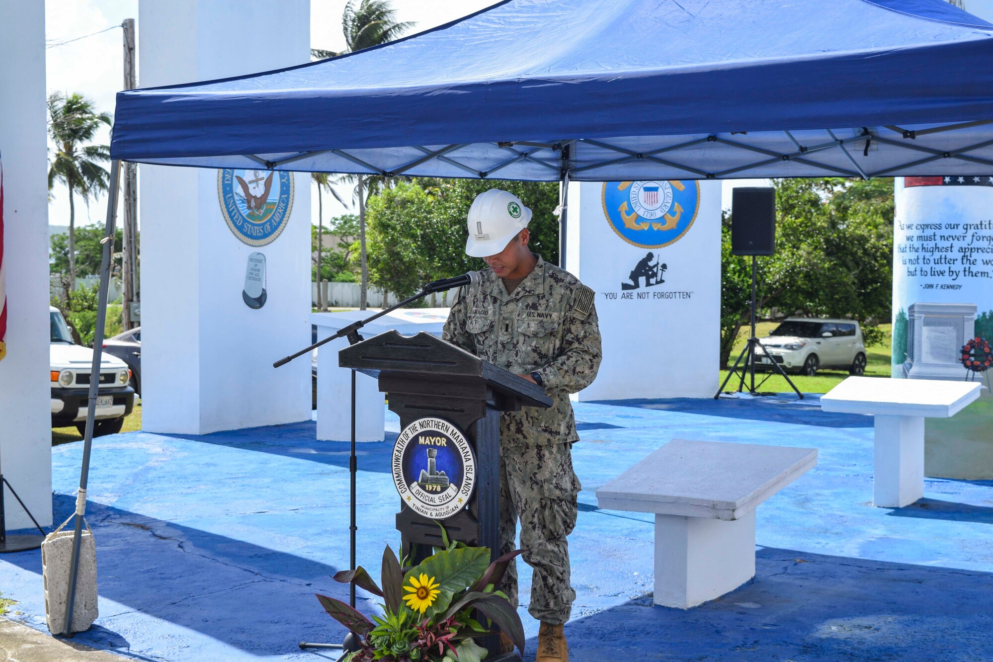 TINIAN, Commonwealth of the Northern Mariana Islands (Nov. 11, 2020) Lt. j.g. Aaron Ignacio, officer-in-charge of U.S. Naval Mobile Construction Battalion (NMCB) 3 Detail Tinian, delivers remarks during Tinian�s 2020 Veterans Day Program at Tinian Veteran Memorial Park. NMCB-3 is deployed across the Indo-Pacific region conducting high-quality construction to support U.S. and partner nations to strengthen partnerships, deter aggression and enable expeditionary logistics and naval power projection. The battalion stands ready to support Major Combat Operations throughout the area of responsibility. (U.S. Navy photo by Construction Electrician 3rd Class Marcus Henley)
