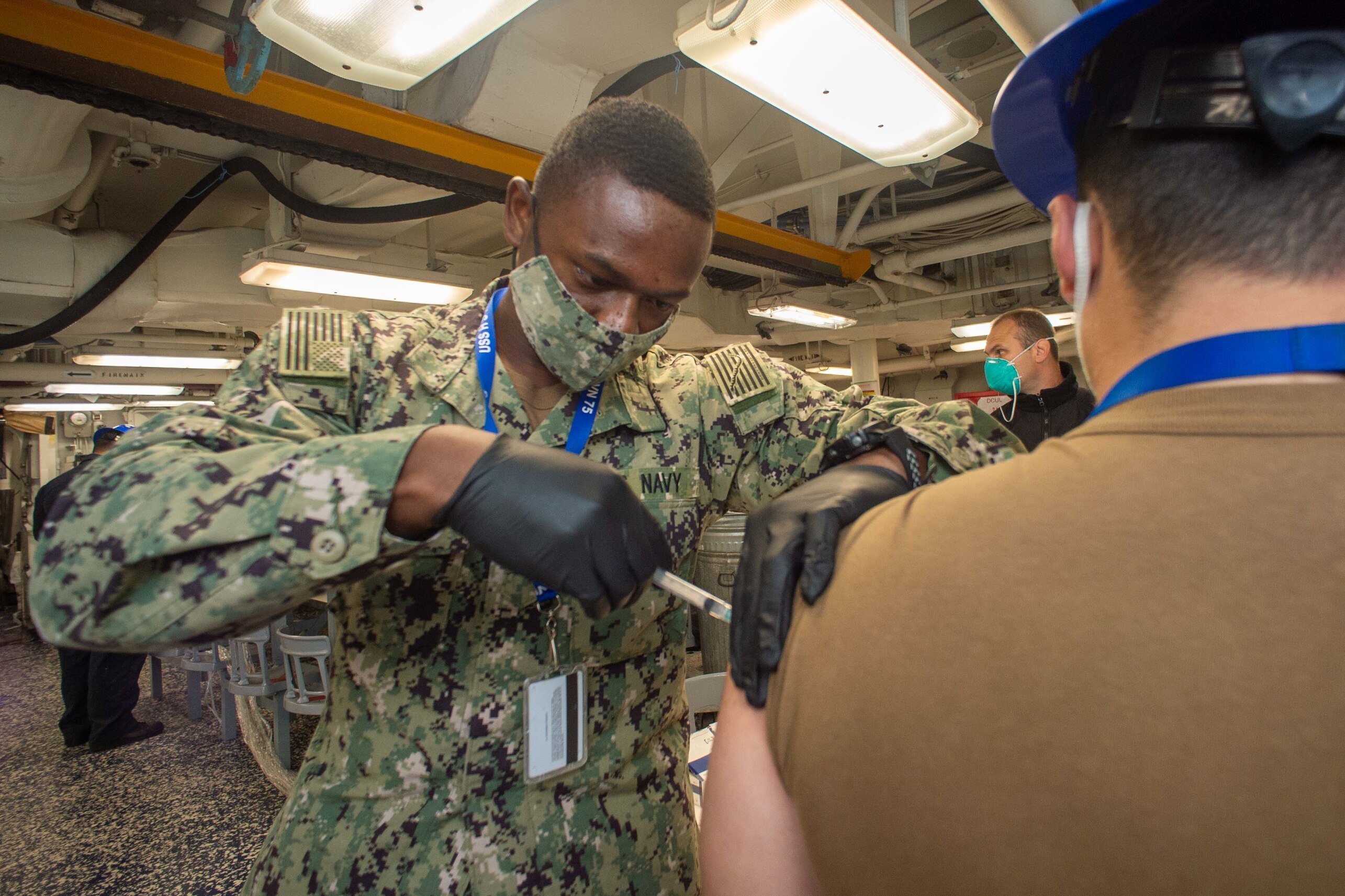 PORTSMOUTH, Va. (Nov. 3, 2020) Hospital Corpsman 3rd Class Vincent Murray, from Chesapeake, Va., administers a seasonal flu shot in the forward mess decks of the Nimitz-class aircraft carrier USS Harry S. Truman (CVN 75). Truman is currently in Norfolk Naval Shipyard for its Extended Carrier Incremental Availability (ECIA) period. (U.S. Navy photo by Mass Communications Specialist Seaman Apprentice Christopher Suarez)