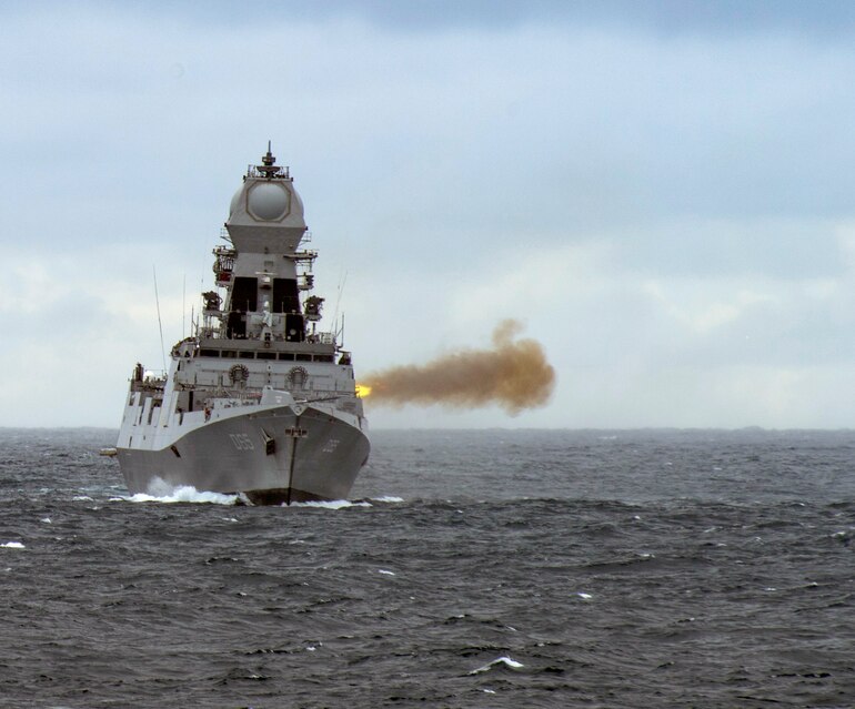 ARABIAN SEA (Nov. 19, 2020) The Indian navy destroyer INS Chennai (D65) fires its close-in weapons system during a live-fire exercise as part of Malabar 2020. Malabar 2020 is the latest in a continuing series of exercises that has grown in scope and complexity over the years to address the variety of shared threats to maritime security in the Indo-Pacific where the U.S. Navy has patrolled for more than 70 years promoting regional peace and security. The Nimitz Carrier Strike Group is currently deployed to the U.S. 7th Fleet area of operations in support of a free and open Indo-Pacific. (U.S. Navy photo by Mass Communication Specialist Seaman Drace Wilson)