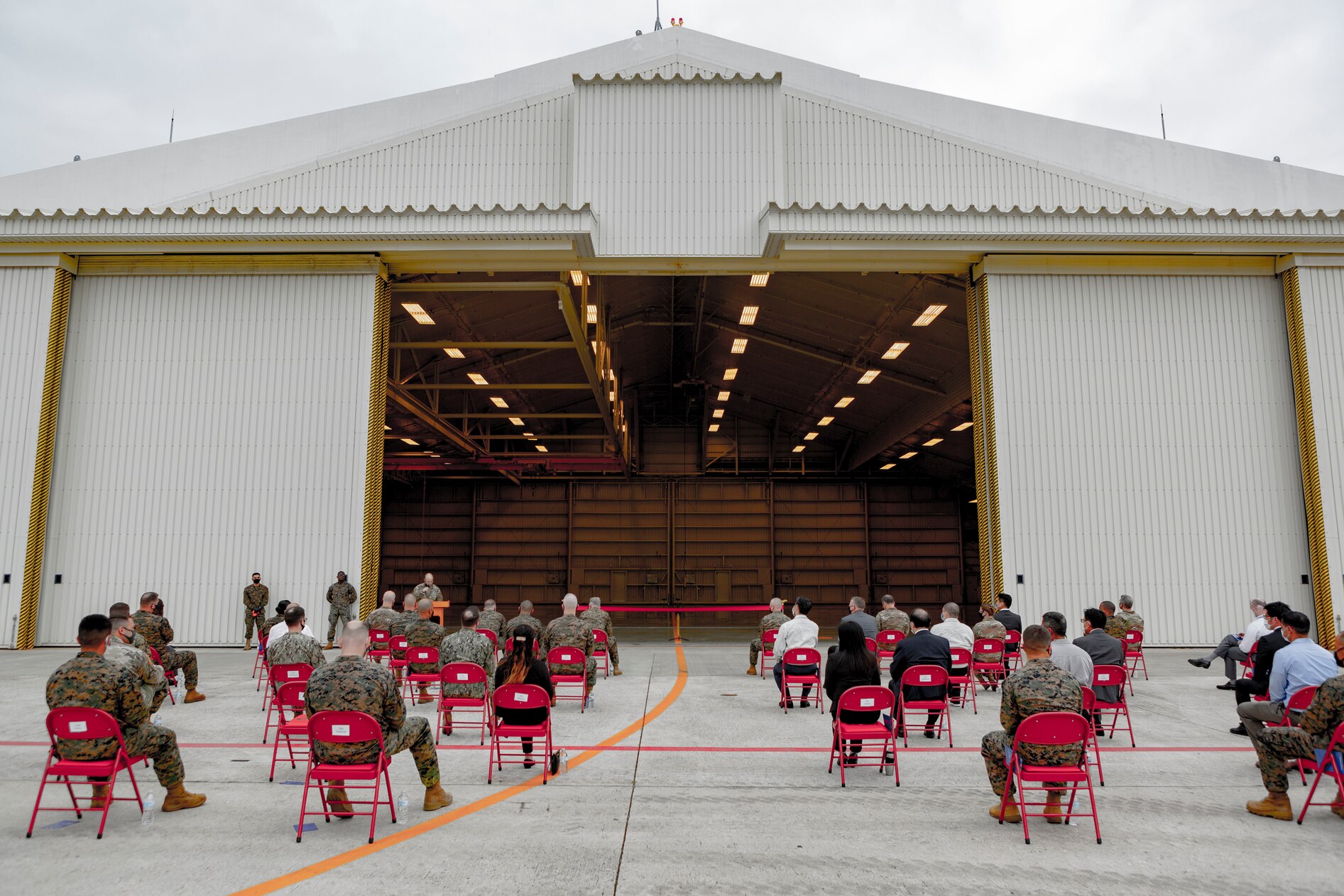 KADENA AIR BASE, Okinawa (Nov. 24, 2020) Marine Wing Liaison Kadena (MWLK) hosts a ribbon cutting ceremony on Kadena Air Base, Okinawa, Japan, Nov. 24, 2020. The ceremony celebrated the grand opening of a hangar operated by MWLK. MWLK provides comprehensive operational and logistical support to local and deployed U.S. Marine Corps and U.S. Navy squadrons operating at Kadena Air Base. (U.S. Marine Corps Photo by Cpl. Christopher A. Madero)