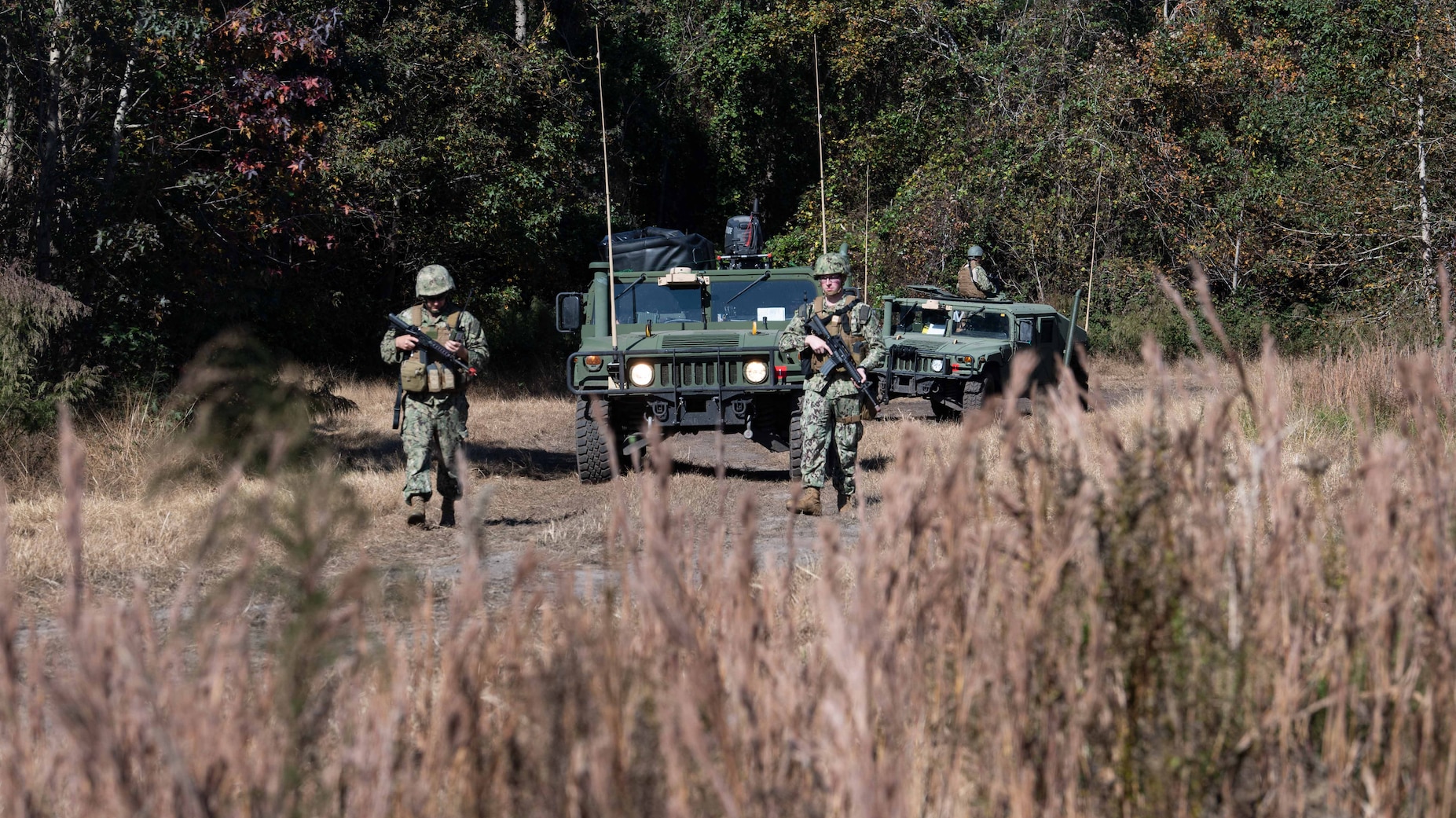 MOYOCK, N.C. (Nov. 7, 2020) U.S. Sailors assigned to Underwater Construction Team (UCT) One conduct a security detail exercise, Nov. 7, 2020. UCT-1 is conducting a final evaluation phase exercise, retaining certifications and preparing for an upcoming deployment. (U.S. Navy photo by Mass Communication Specialist 3rd Class Griffin Kersting)