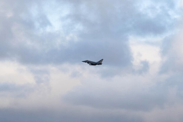 German Air Force Eurofighter F2000 aircraft conducts a flyover above the Arleigh Burke-class guided-missile destroyer USS Ross (DDG 71), not pictured, during a NATO air defense exercise, Nov. 28, 2020. Ross is currently on its 10th Forward Deployed Naval Forces-Europe (FDNF-E) patrol in the U.S. Sixth Fleet area of operations in support of U.S. national security interests in Europe and Africa.
