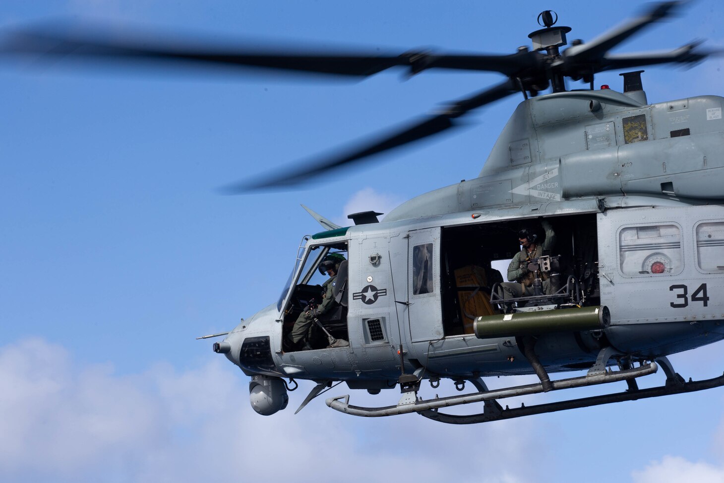 PACIFIC OCEAN (Nov. 23, 2020) Capt. John Kurtz, the commanding officer of the amphibious transport dock ship USS Somerset (LPD 25), co-pilots a UH-1Y Venom alongside Marines with Marine Medium Tiltrotor Squadron 164 (Reinforced), 15th Marine Expeditionary Unit. The Makin Island Amphibious Ready Group and the 15th MEU are currently conducting routine operations in the U.S. 3rd Fleet area of operations. (U.S. Marine Corps photo by Lance Cpl. Brendan Mullin)