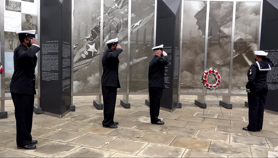 PITTSBURGH (Dec 7, 2020) Sailors assigned to Navy Talent Acquisition Group (NTAG) Pittsburgh, render a salute for the fallen at the Pearl Harbor Day Remembrance ceremony at the Southwestern Pennsylvania World War II Memorial in Pittsburgh, Pa. The Southwestern Pennsylvania World War II Memorial commemorates the efforts of veterans from this region who served in Europe, North Africa, and the Pacific, as well as the men and women who contributed to the war efforts at home. Established August 1, 2018, NTAG Pittsburgh oversees Navy recruiting efforts over approximately 65,000 square miles of territory throughout parts of western Pennsylvania, New York, West Virginia and Maryland. (U.S. Navy photo by Mass Communication Specialist 1st Class Benjamin Dobbs)