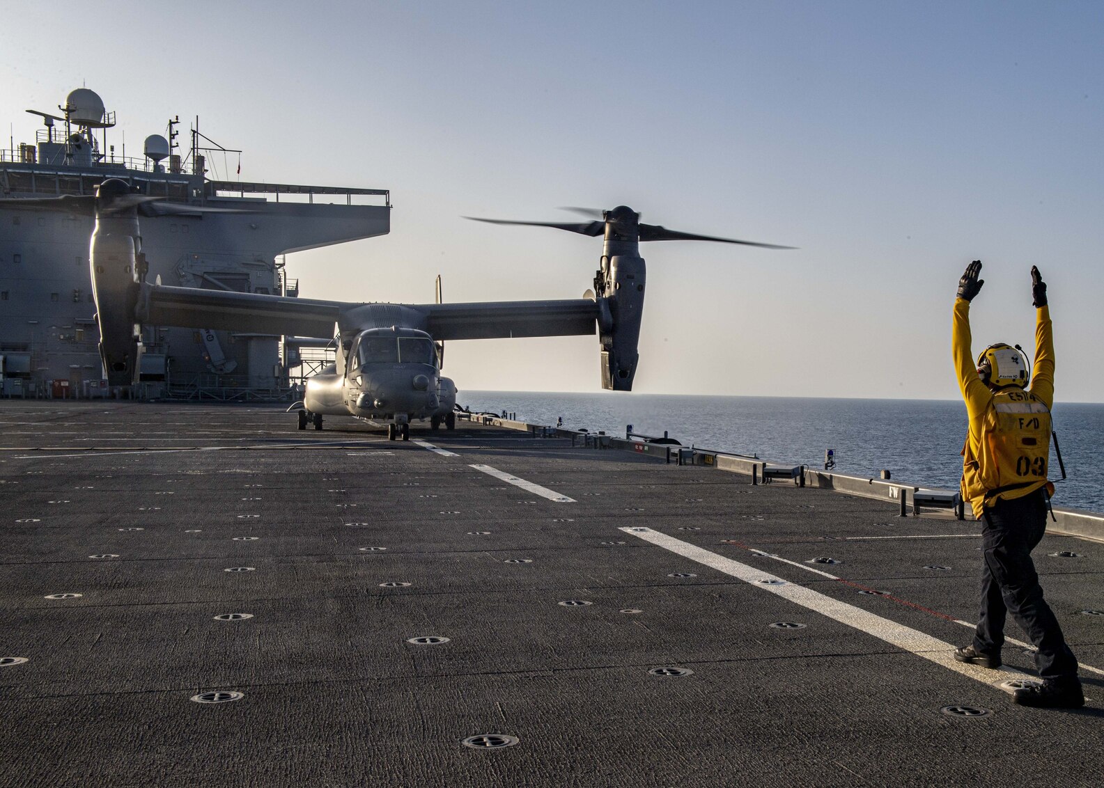 GULF OF ADEN (Dec. 12, 2020) Airman Dawson Besmer signals to a MV-22 Osprey tiltrotor aircraft, attached to 352nd Special Operations Wing (SOW), on the flight deck of the Expeditionary Sea Base USS Hershel "Woody" Williams (ESB 4), Dec. 12, 2020. Hershel "Woody" Williams is on its inaugural deployment in the U.S. Naval Forces Europe-Africa area of responsibility in support of maritime missions and special operations. (U.S. Navy photo by Mass Communication Specialist Seaman Conner Foy)