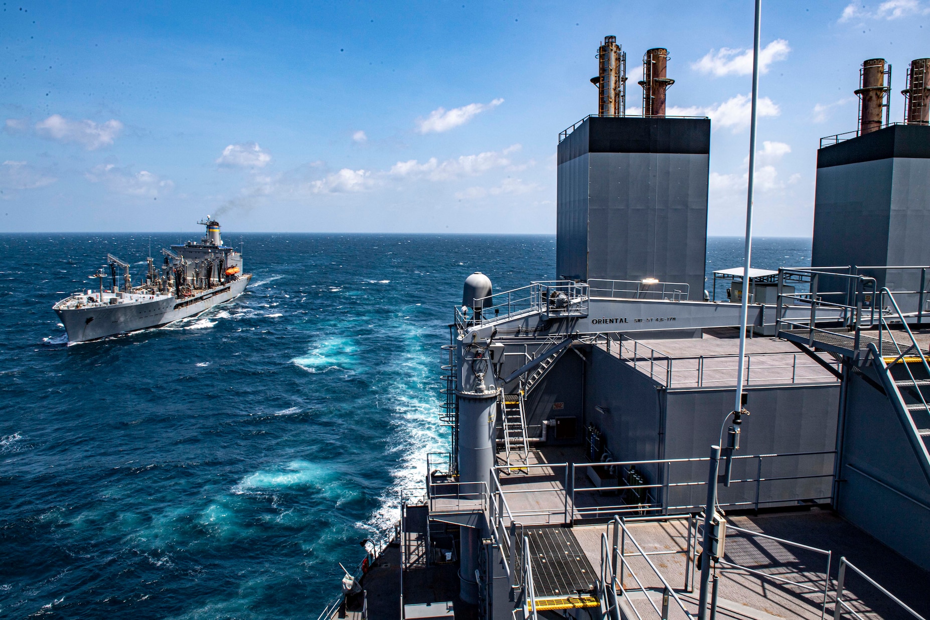 INDIAN OCEAN (Dec. 26, 2020) The Fleet replenishment oiler USNS Big Horn (T-AO 198) pulls along side the Expeditionary Sea Base USS Hershel "Woody" Williams (ESB 4) to conduct a fueling-at-sea. Hershel "Woody" Williams is on its inaugural deployment in the U.S. Naval Forces Europe-Africa area of responsibility in support of maritime missions and special operations. (U.S. Navy photo by Mass Communication Specialist Seaman Conner Foy)