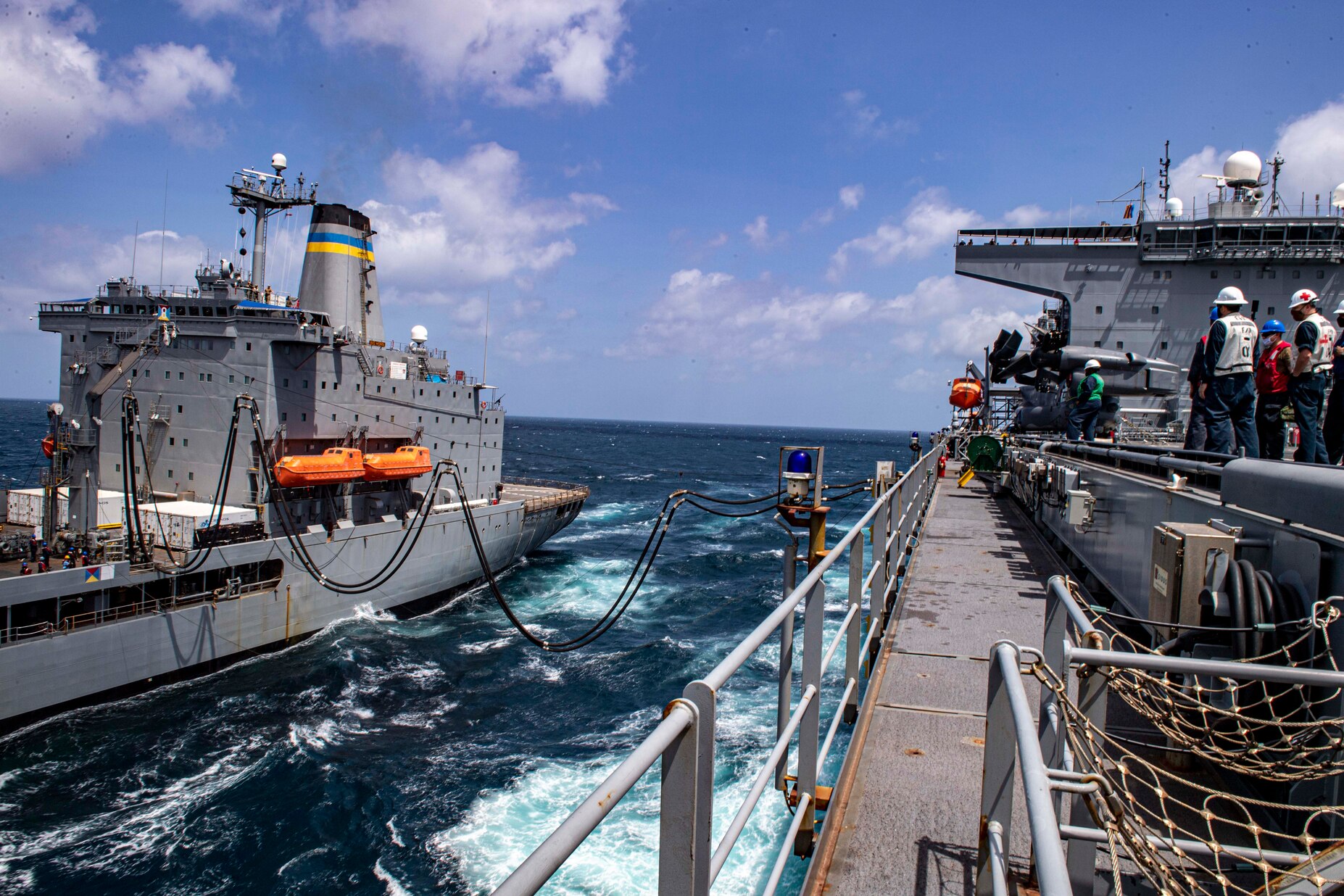 INDIAN OCEAN (Dec. 26, 2020) The Expeditionary Sea Base USS Hershel "Woody" Williams, right, conducts a fueling-at-sea with the fleet replenishment oiler USNS Big Horn (T-AO 198). Hershel "Woody" Williams is on its inaugural deployment in the U.S. Naval Forces Europe-Africa area of responsibility in support of maritime missions and special operations. (U.S. Navy photo by Mass Communication Specialist Seaman Conner Foy)