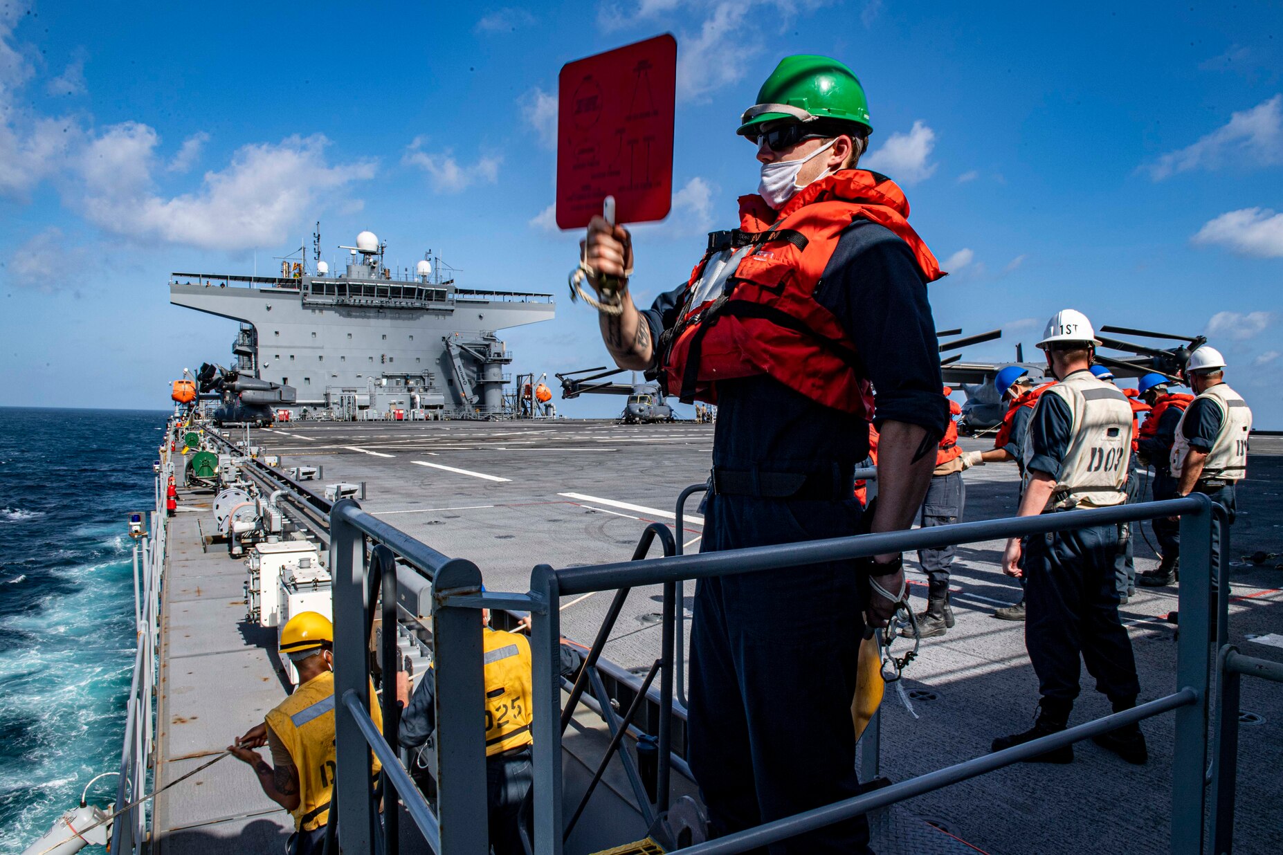 INDIAN OCEAN (Dec. 26, 2020) Boatswain's Mate Seaman Avery Hawkinson gives signals from the flight deck of the USS Hershel "Woody" Williams (ESB 4) during at fueling at sea (FAS) with the fleet replenishment oiler USNS Big Horn (T-AO-198). Hershel "Woody" Williams is on its inaugural deployment in the U.S. Naval Forces Europe-Africa area of responsibility in support of maritime missions and special operations. (U.S. Navy photo by Mass Communication Specialist Seaman Conner Foy)