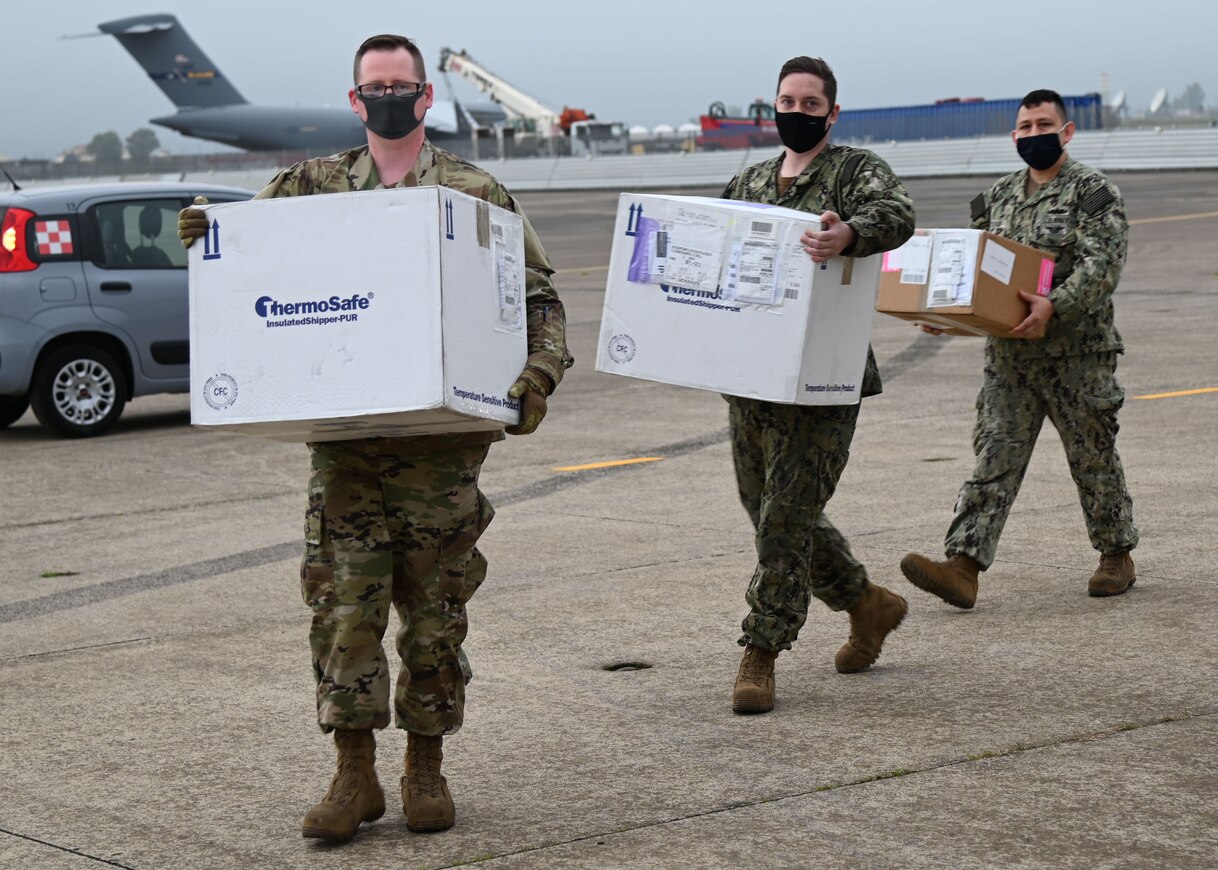 SIGONELLA, Italy (Jan. 9, 2021) U.S. service members assigned to Defense Logistics Agency Distribution Sigonella load boxes of the Moderna COVID-19 vaccines onto a C-26D Metroliner aircraft at Naval Air Station (NAS) Sigonella for shipment to Naval Support Activity Souda Bay, Greece, Jan. 9, 2021. NAS Sigonella’s strategic location enables U.S., allied, and partner nation forces to deploy and respond as required to ensure security and stability in Europe, Africa and Central Command.