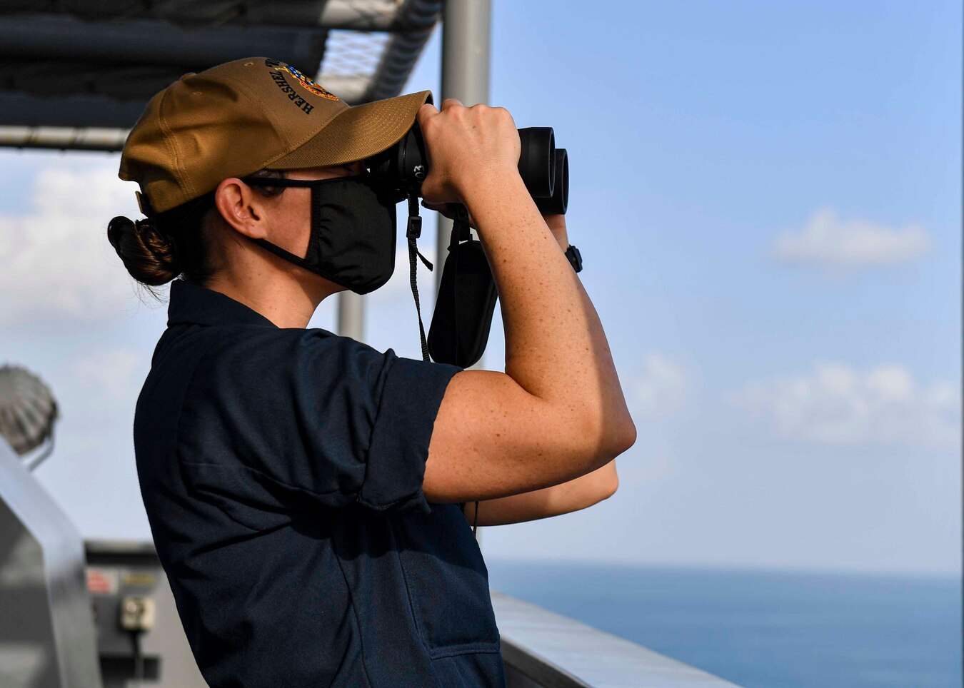 HORN OF AFRICA (Jan. 30, 2021) Cryptologic Technician (Maintenance) 2nd Class Kalynn Fitzgerald looks through a pair of binoculars as a member of the Ship's Nautical or Otherwise Photographic Interpretation and Exploitation (SNOOPIE) team during underway operations aboard the Expeditionary Sea Base USS Hershel "Woody"Williams (ESB 4) from Port Djibouti, Jan. 30, 2021. Hershel Williams conducted underway operations in preparation for an interoperability event with French Army Puma and USMC MV-22 aircraft. (U.S. Navy photo by Mass Communication Specialist 2nd Class Eric Coffer)