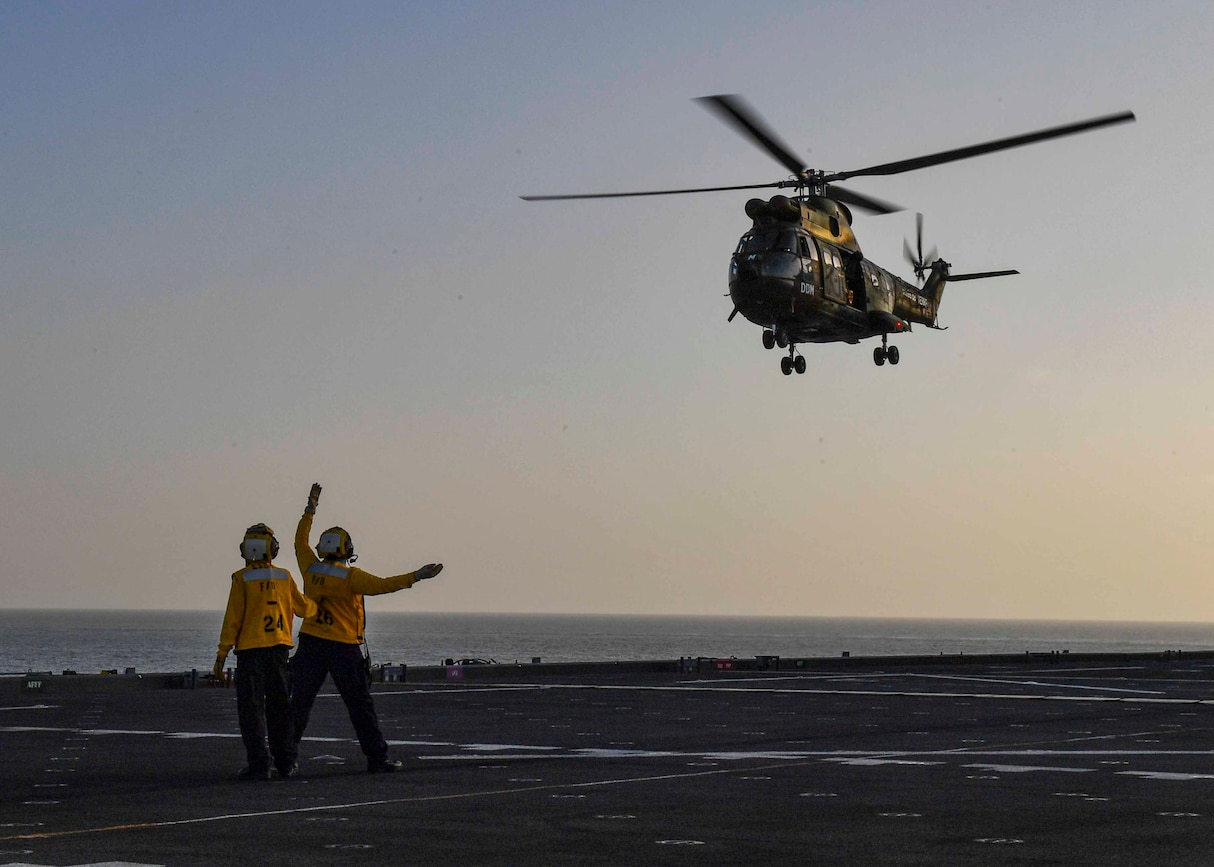 HORN OF AFRICA (Jan. 30, 2021) Landing signalmen enlisted Aviation Boatswain’s Mate 3rd Class Sydney Payne, right, and Aviation Boatswain’s Mate 3rd Class Kieara Dexter land an SA 330 Puma helicopter assigned to the French army 5th Overseas Interarms Regiment during interoperability flight operations aboard the expeditionary sea base USS Hershel “Woody” Williams (ESB 4) while operating off the Horn of Africa, Jan. 30, 2021. (U.S. Navy photo by Mass Communication Specialist 2nd Class Eric Coffer)
