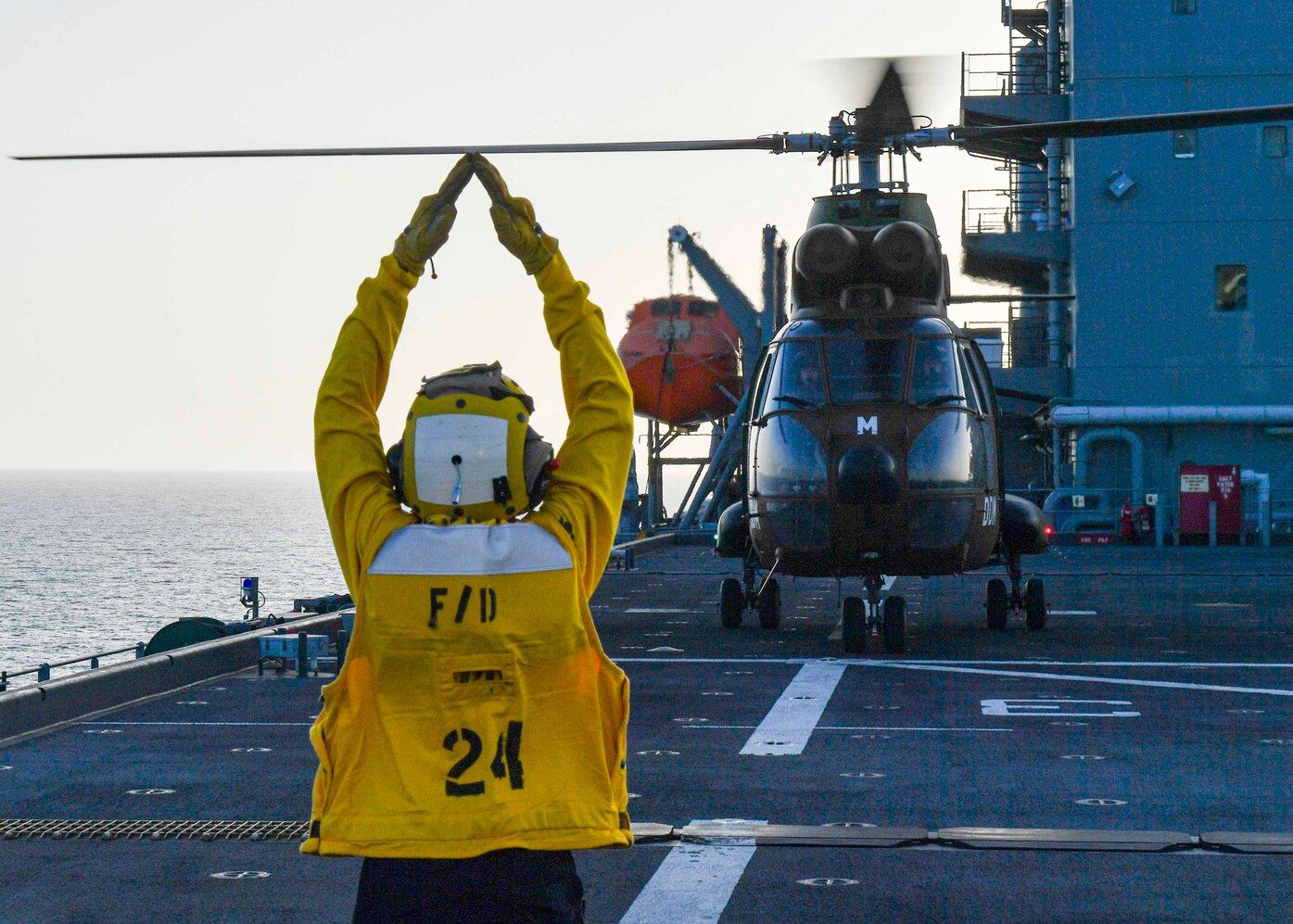 HORN OF AFRICA (Jan. 30, 2021) Landing Signalman Enlisted Aviation Boatswain's Mate 3rd Class Kieara Dexter lands a French SA 330 Puma helicopter from the 5th Overseas Interarms Regiment as part of the Expeditionary Sea Base Hershel "Woody"Williams (ESB 4) interoperability flight operations while operating off the Horn of Africa, Jan. 30, 2021. Hershel Williams' flight deck crew simultaneously directed deck landing qualifications for multiple U.S. Marine Corps MV-22 Osprey pilots from the North and West Africa Response Force Aviation Combat Element. (U.S. Navy photo by Mass Communication Specialist 2nd Class Eric Coffer)