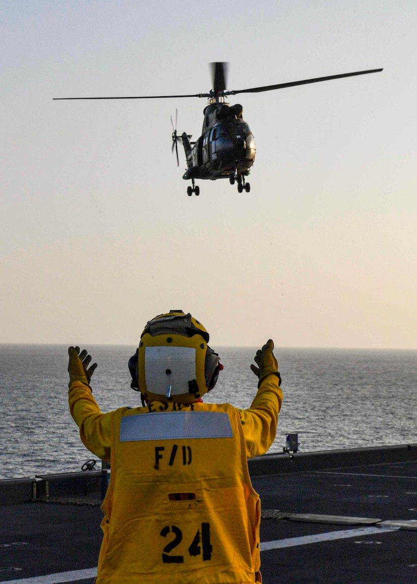 HORN OF AFRICA (Jan. 30, 2021) Landing signalman enlisted Aviation Boatswain’s Mate 3rd Class Kieara Dexter lands a French army SA 330 Puma helicopter from France's 5th Overseas Interarms Regiment during interoperability flight operations aboard the expeditionary sea base USS Hershel “Woody” Williams (ESB 4) while operating off the Horn of Africa, Jan. 30, 2021. (U.S. Navy photo by Mass Communication Specialist 2nd Class Eric Coffer)