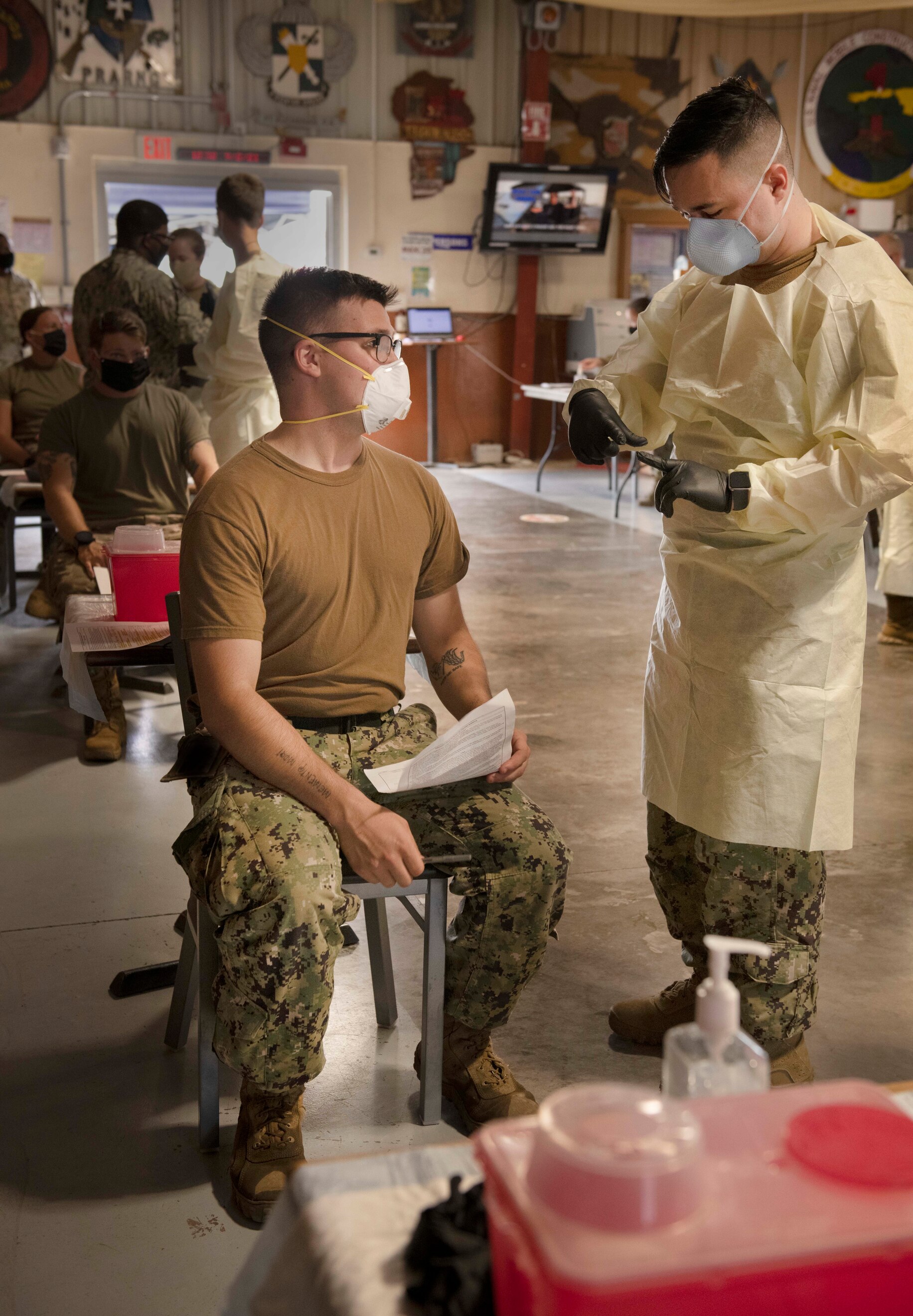 CAMP LEMONNIER, Djibouti (Feb. 9, 2021) Hospital Corpsman Mitchell Landon from Buffalo N.Y., left, and Hospital Corpsman 2nd Class Pedro Perez from Austin, Texas, both assigned to the Expeditionary Medical Facility, Camp Lemonnier, discuss medical information during a COVID-19 vaccine administration on base, Feb. 9, 2021. This is the first time the vaccine has been available at this base. Camp Lemonnier is an operational installation that enables U.S., allied and partner nation forces to be where and when they are needed to ensure security in Europe, Africa and Southwest Asia. This photo has been edited to remove personally identifiable information. (U.S. Navy illustration by Mass Communication Specialist 1st Class Natalia Murillo)