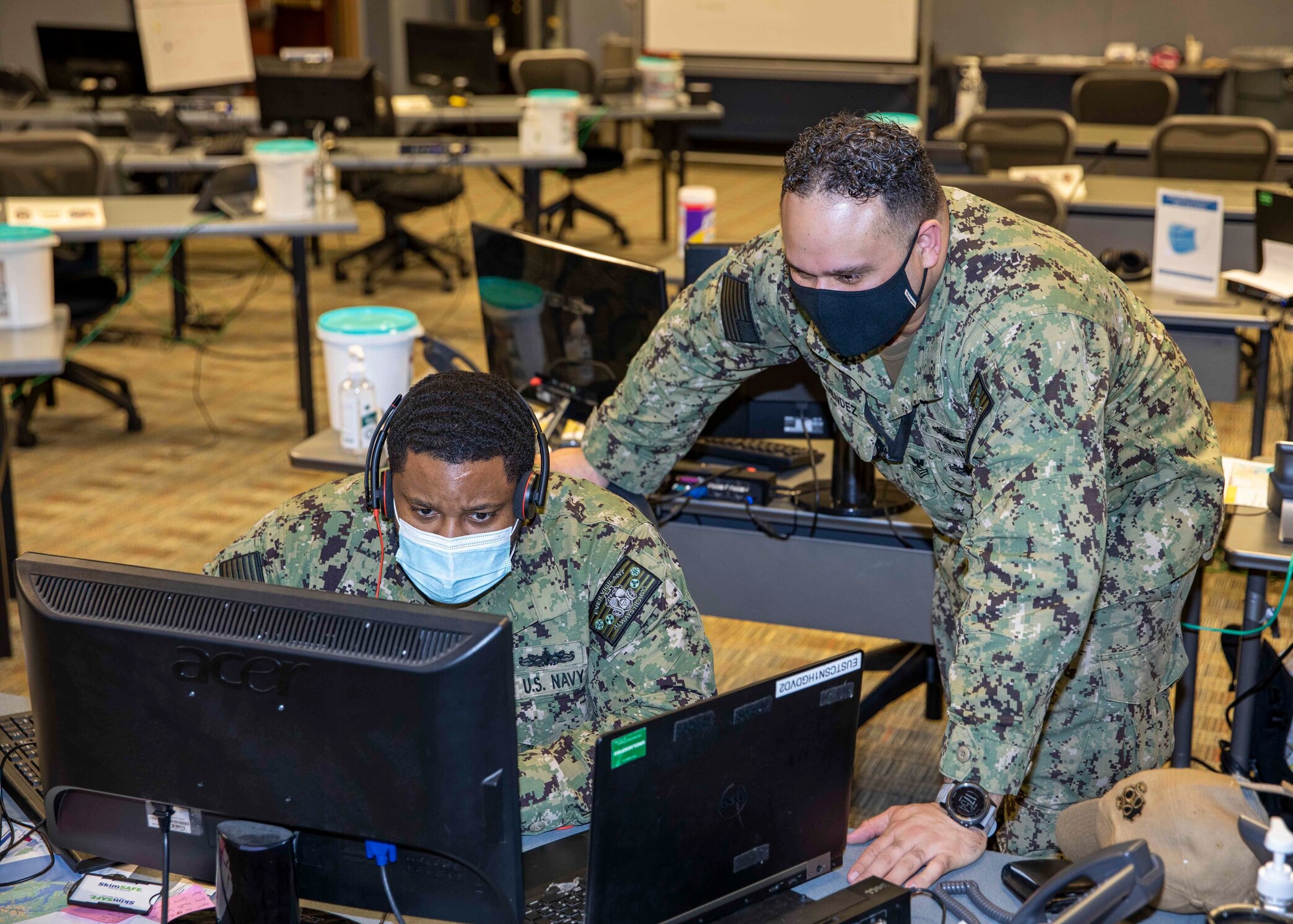 JOINT BASE LANGLEY-EUSTIS, Va. (Feb. 13, 2021)Damage Controlman 2nd Class Thaddeus Malone, left, and Operations Specialist 1st Class Jose Mendez, both assigned to Task Force Northeast, review an email before sending it to U.S. Army North as part of their watch standing duties in the command's Joint Operations Center during distributed operations in support of COVID-19 vaccine operations, Feb. 13, 2021. U.S. Northern Command, through U.S. Army North, remains committed to providing flexible Department of Defense support to the whole-of-government COVID-19 response. (U.S. Navy photo by Mass Communication Specialist 2nd Class Michael H. Lehman)