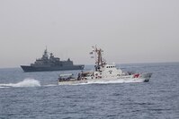 ARABIAN GULF (Feb. 25, 2021) The U.S. Coast Guard cutter USCGC Maui (WPB 1304) and Greek navy guided-missile frigate HS Hydra (F452) participate in a passing exercise in the Arabian Gulf, Feb. 25, 2021. U.S. Coast Guard Patrol Forces Southwest Asia (PATFORSWA) is comprised of six 110-foot cutters, the Maritime Engagement Team, shore-side support personnel, and is the Coast Guard's largest unit outside of the U.S. playing a key role in supporting Navy security cooperation, maritime security, and maritime infrastructure protection operations in the U.S. 5th Fleet area of operations. (U.S. Coast Guard photo)