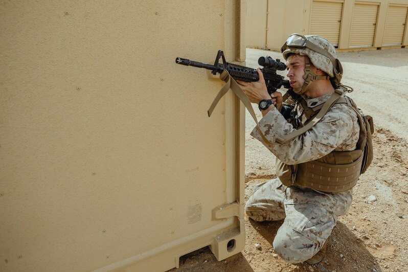 MARINE CORPS AIR GROUND COMBAT CENTER TWENTYNINE PALMS, Calif. (Feb. 3, 2021) Hospital Corpsman 2nd Class Zachary Knueven provides security during Integrated Training Exercise (ITX) 2-21 on Marine Corps Air Ground Combat Center Twentynine Palms, California, Feb. 3, 2021. Marines and Sailors with Combat Logistics Battalion 6, Combat Logistics Regiment 2, 2nd Marine Logistics Group is training at ITX as the logistics combat element to provide tactical logistics in the areas of medium and heavy-lift motor transportation beyond 6th Marine Regiment's organic capabilities. (U.S. Marine Corps photo by Cpl. Christian M. Garcia)