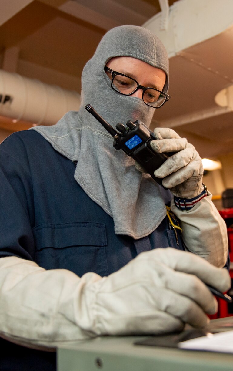 PACIFIC OCEAN (Feb. 6, 2021) Lt. Sean Wuestenhoefer, from Greenville, Miss., responds to damage reported during a general quarters drill aboard the aircraft carrier USS Carl Vinson (CVN 70). Carl Vinson is currently underway conducting routine maritime operations. (U.S. Navy photo by Mass Communication Specialist 3rd Class Aaron T. Smith)