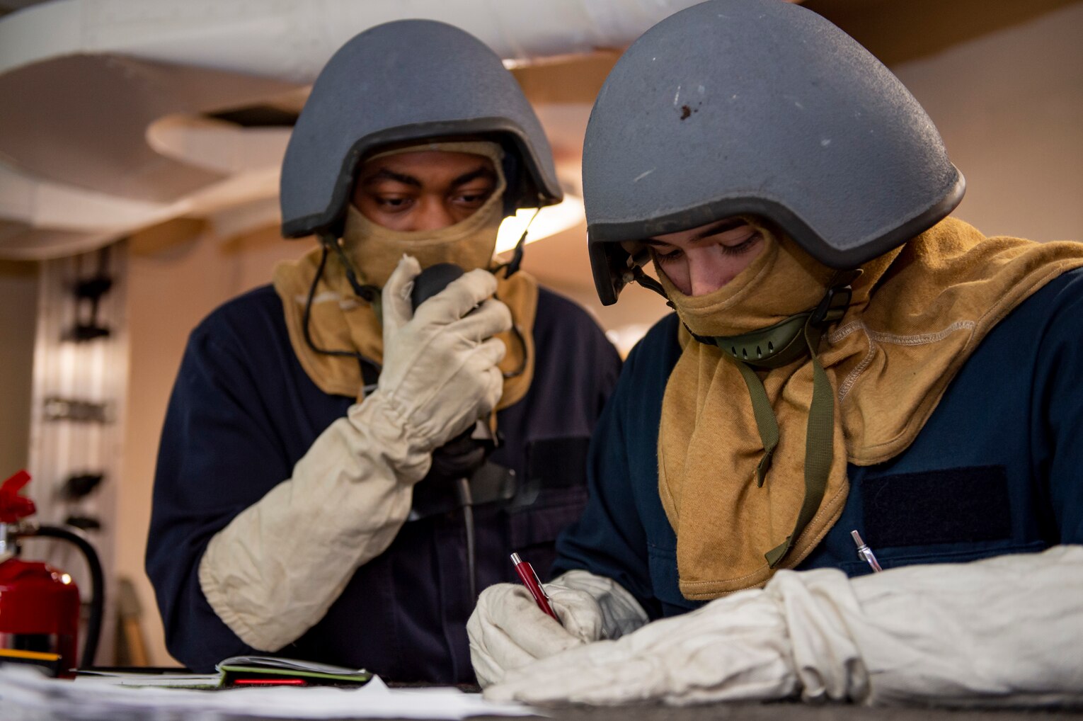 PACIFIC OCEAN (Feb. 6, 2021) Aviation Electrician’s Mate Airman Elijah Steel, from Houston, talks on a sound powered telephone during a general quarters drill aboard the aircraft carrier USS Carl Vinson (CVN 70). Carl Vinson is currently underway conducting routine maritime operations. (U.S. Navy photo by Mass Communication Specialist 3rd Class Aaron T. Smith)