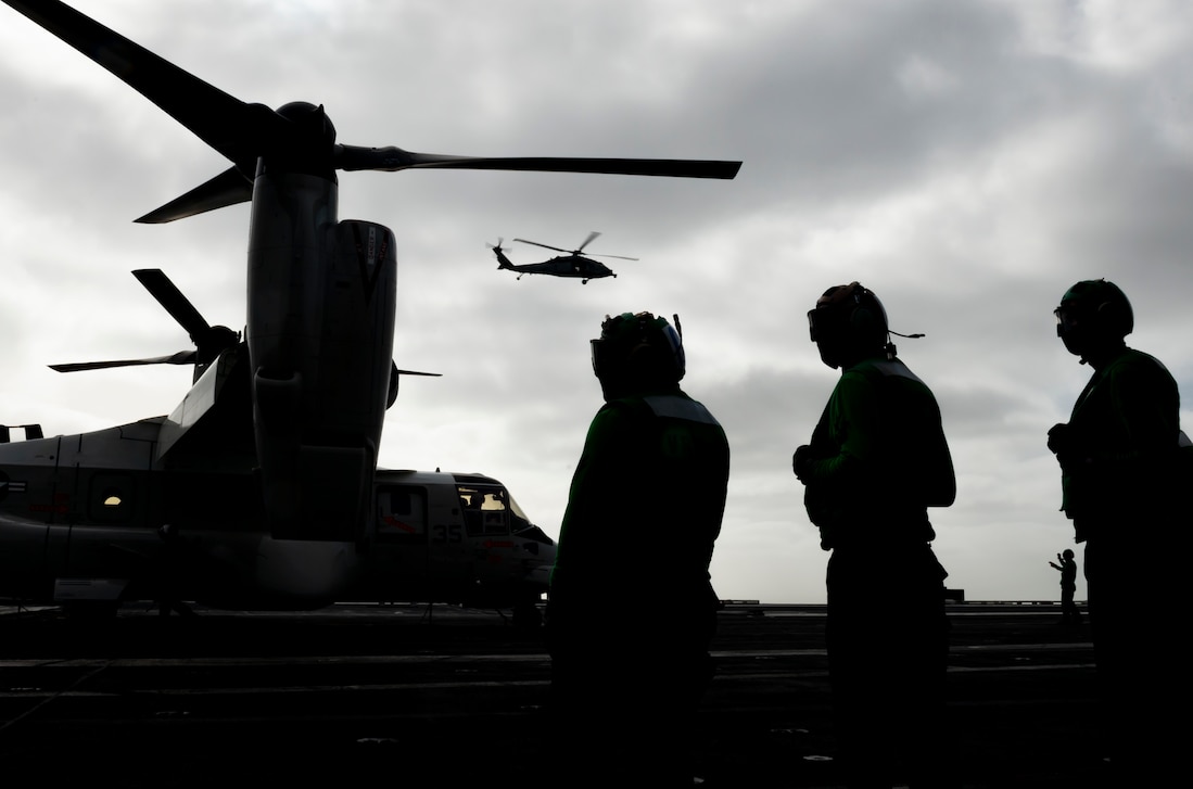 PACIFIC OCEAN (Feb. 16, 2021) Sailors assigned to the “Titans” of Fleet Logistics Multi-Mission Squadron (VRM) 30 observe flight operations aboard the aircraft carrier USS Carl Vinson (CVN 70). Carl Vinson is currently underway conducting routine maritime operations. (U.S. Navy photo by Mass Communication Specialist 3rd Class Aaron T. Smith)