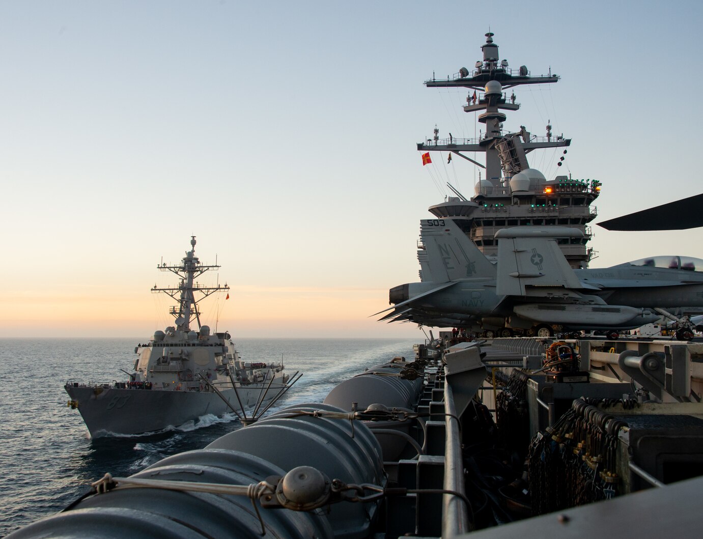 PACIFIC OCEAN (Feb. 24, 2021) The Arleigh Burke-class destroyer USS Howard (DDG 83) approaches the aircraft carrier USS Carl Vinson (CVN 70) for a replenishment-at-sea. Carl Vinson is currently underway conducting routine maritime operations. (U.S. Navy photo by Mass Communication Specialist 3rd Class Aaron T. Smith)