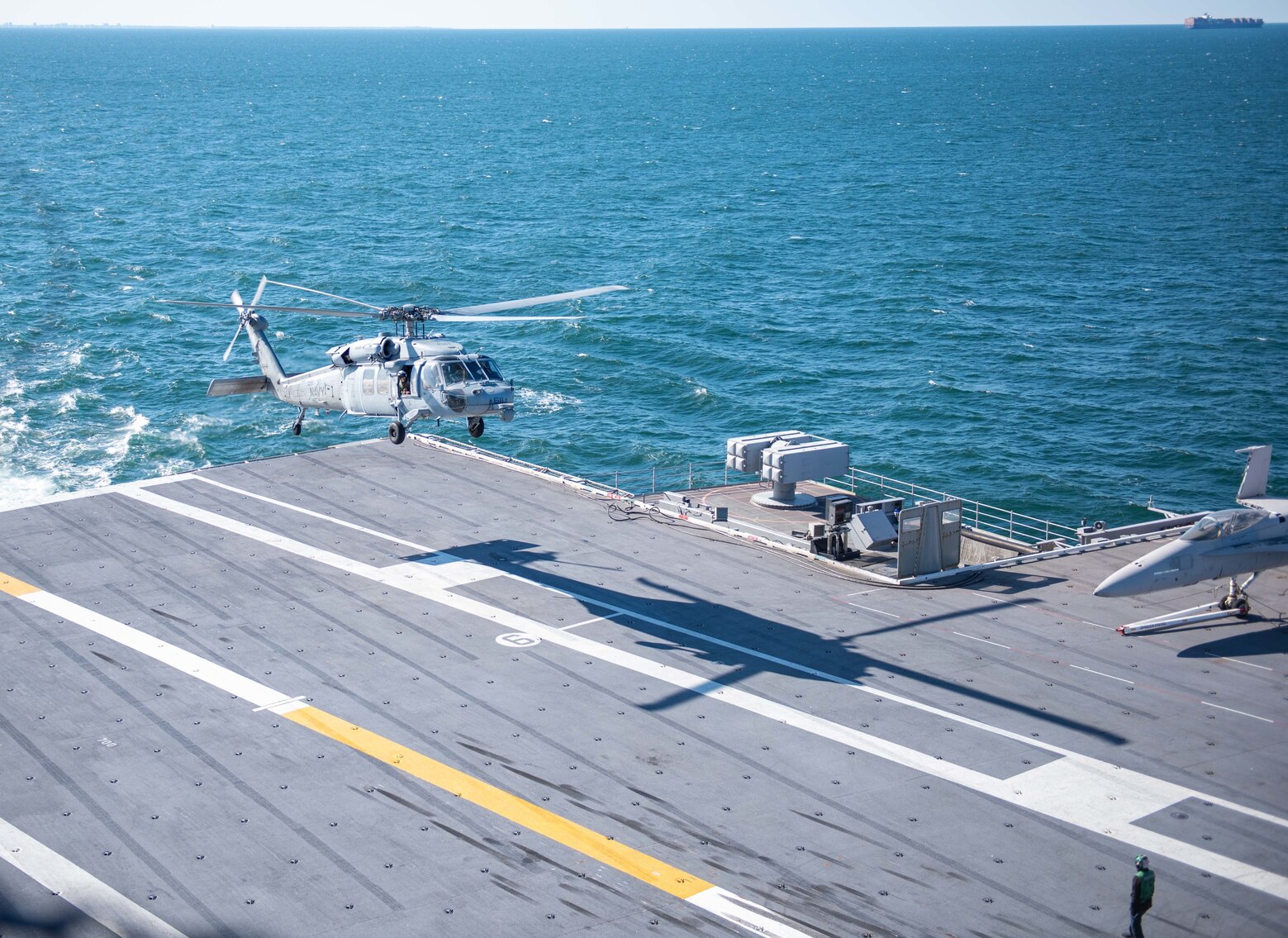 ATLANTIC OCEAN (March 7, 2021) An MH-60S Sea Hawk assigned to the �Tridents� of Helicopter Sea Combats Squadron (HSC) 9 approaches the flight deck of the aircraft carrier USS Gerald R. Ford (CVN 78), March 7, 2021. Gerald R. Ford is underway in the Atlantic Ocean conducting an independent steaming event. (U.S. Navy photo by Mass Communication Specialist 3rd Class Michael Joseph Flesch)