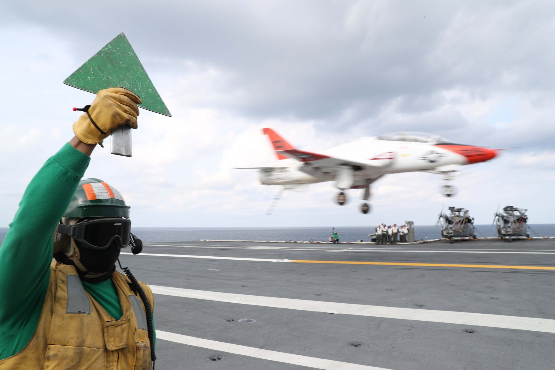 ATLANTIC OCEAN (March 14, 2021) Aviation Boatswain�s Mate (Equipment) 1st Class Andra Coleman, from Mullins, South Carolina, signals the deck is safe while a T-45C Goshawk, attached to Training Air Wing 2, lands on the flight deck of the aircraft carrier USS Gerald R. Ford (CVN 78), March 15, 2021. Gerald R. Ford is underway in the Atlantic Ocean conducting carrier qualifications. (U.S. Navy photo by Chief Mass Communication Specialist RJ Stratchko)