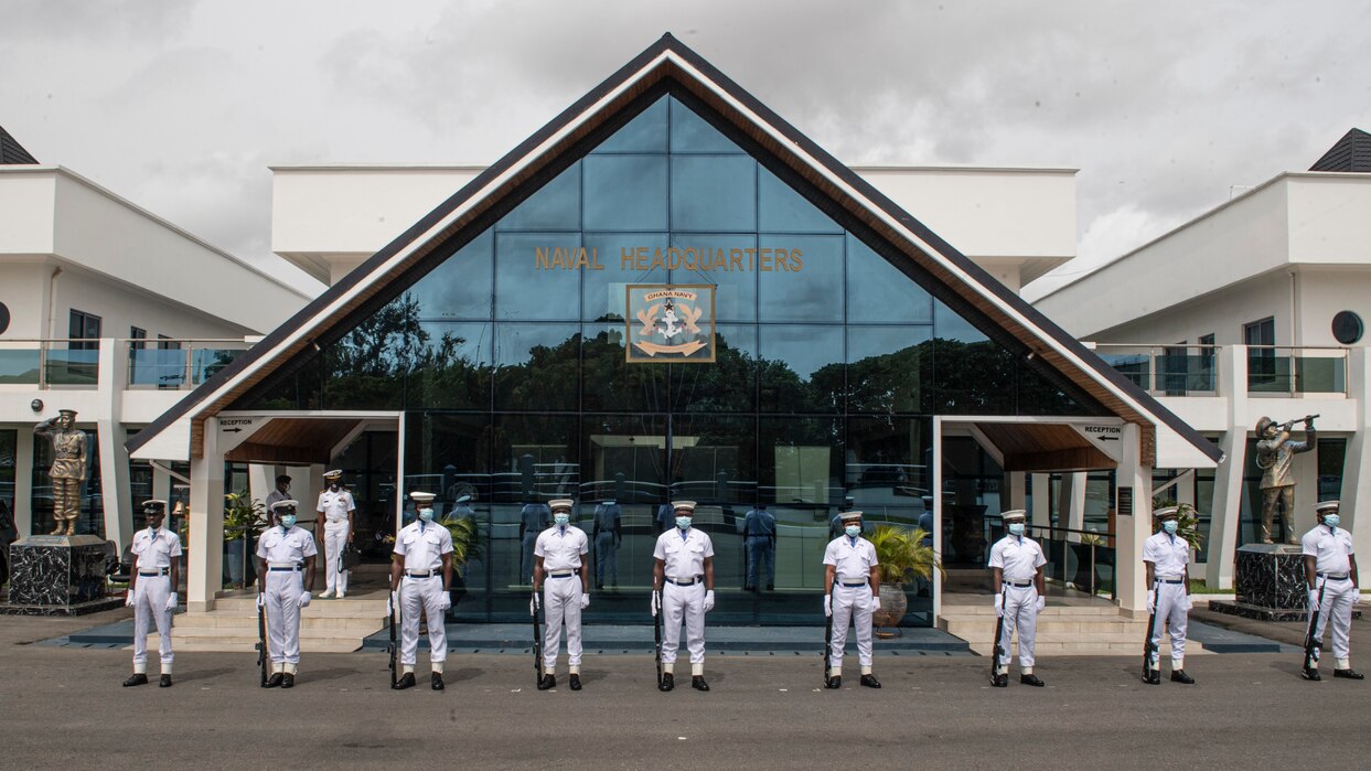 ACCRA, Ghana (March 25, 2021) Ghanaian sailors line up in formation as part of the honor guard to greet Rear Adm. Jeffrey S. Spivey, director, maritime partnership program, U.S. Naval Forces Europe, Africa, 6th Fleet, at the Ghana Naval Headquarters during Exercise Obangame Express in Accra, Ghana, March 25, 2021. Obangame Express, conducted by U.S. Naval Forces Africa, is an at-sea maritime exercise designed to improve cooperation among participating nations in order to increase maritime safety and security in the Gulf of Guinea and West Africa coastal regions. (U.S. Navy photo by Mass Communication Specialist 1st Class Fred Gray IV)