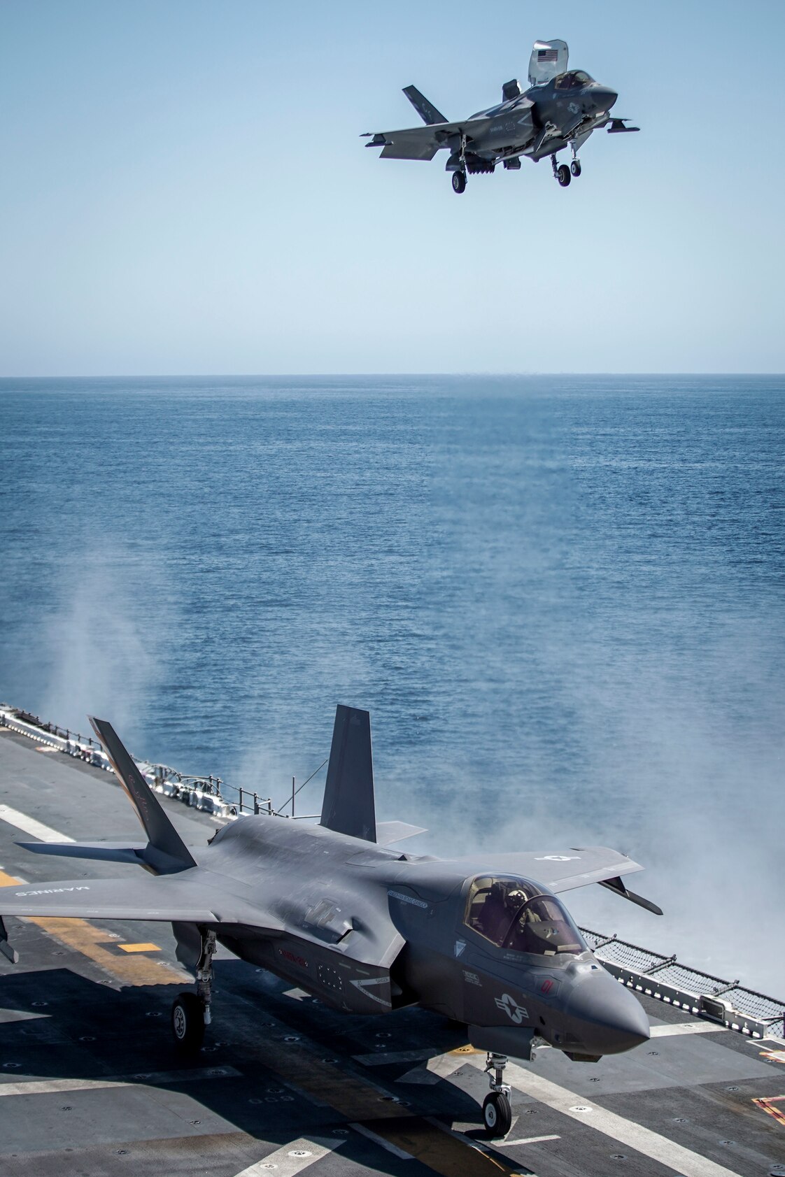 PACIFIC OCEAN (March 24, 2021) U.S. Marine Corps F-35B Lightning II jets with Marine Fighter Attack Squadron (VMFA) 211, Marine Aircraft Group 13, 3rd Marine Aircraft Wing, participate in routine flight operations aboard Wasp-class amphibious assault ship USS Essex (LHD 2). This is the first time the F-35B and AV-8B Harrier with Marine Attack Squadron (VMA) 214, 11th Marine Expeditionary Unit, are training on the same flight deck using Essex as a launch platform. U.S. Navy and Marine Corps integration training provides the Essex Amphibious Ready Group/11th Marine Expeditionary Unit its first opportunity to plan, brief, and execute multiple mission packages. Essex is underway conducting routine operations in U.S. 3rd Fleet. (U.S. Marine Corps photo by Cpl. Israel Chincio)
