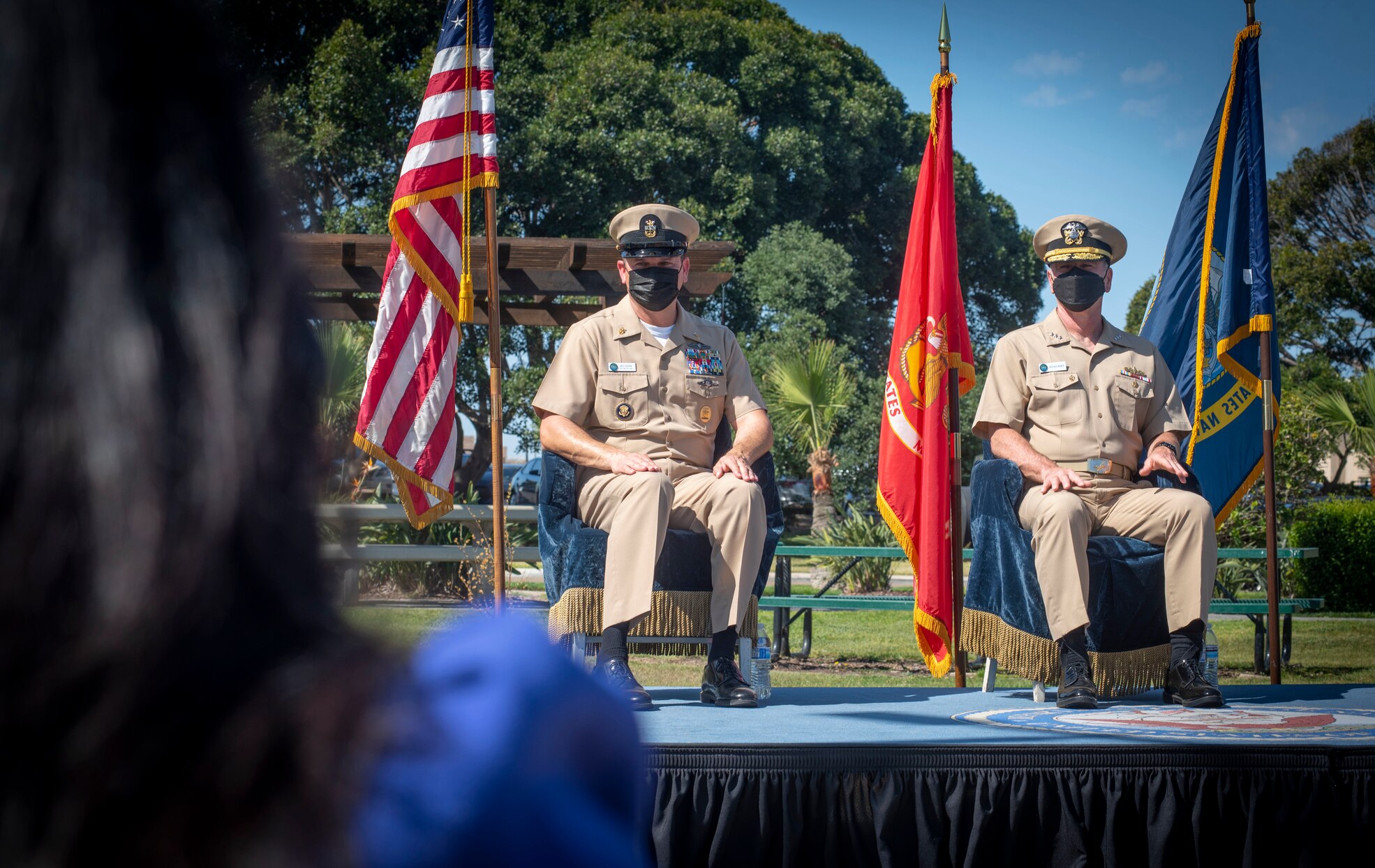 210401-N-YG104-0011 SAN DIEGO (Apr. 1, 2021) Force Master Chief James Osborne (left), and Commander, U.S. Naval Surface Force Pacific, Adm. Roy Kitchener participate in Osborne's retirement ceremony at Naval Amphibious Base Coronado. Osborne is retiring after 34 years of service and is one of the longest-serving Chief Petty Officers in today’s Navy with more than 26 years in the CPO Mess. His career has focused on supporting, advocating for, and training Sailors in damage control – and the critical role it plays in the success of our force. He is retiring after a career of service in the surface force, the joint environment, and in support assignments in the Global War on Terrorism. (U.S. Navy photo by Mass Communication Specialist 1st Class Sarah Villegas)