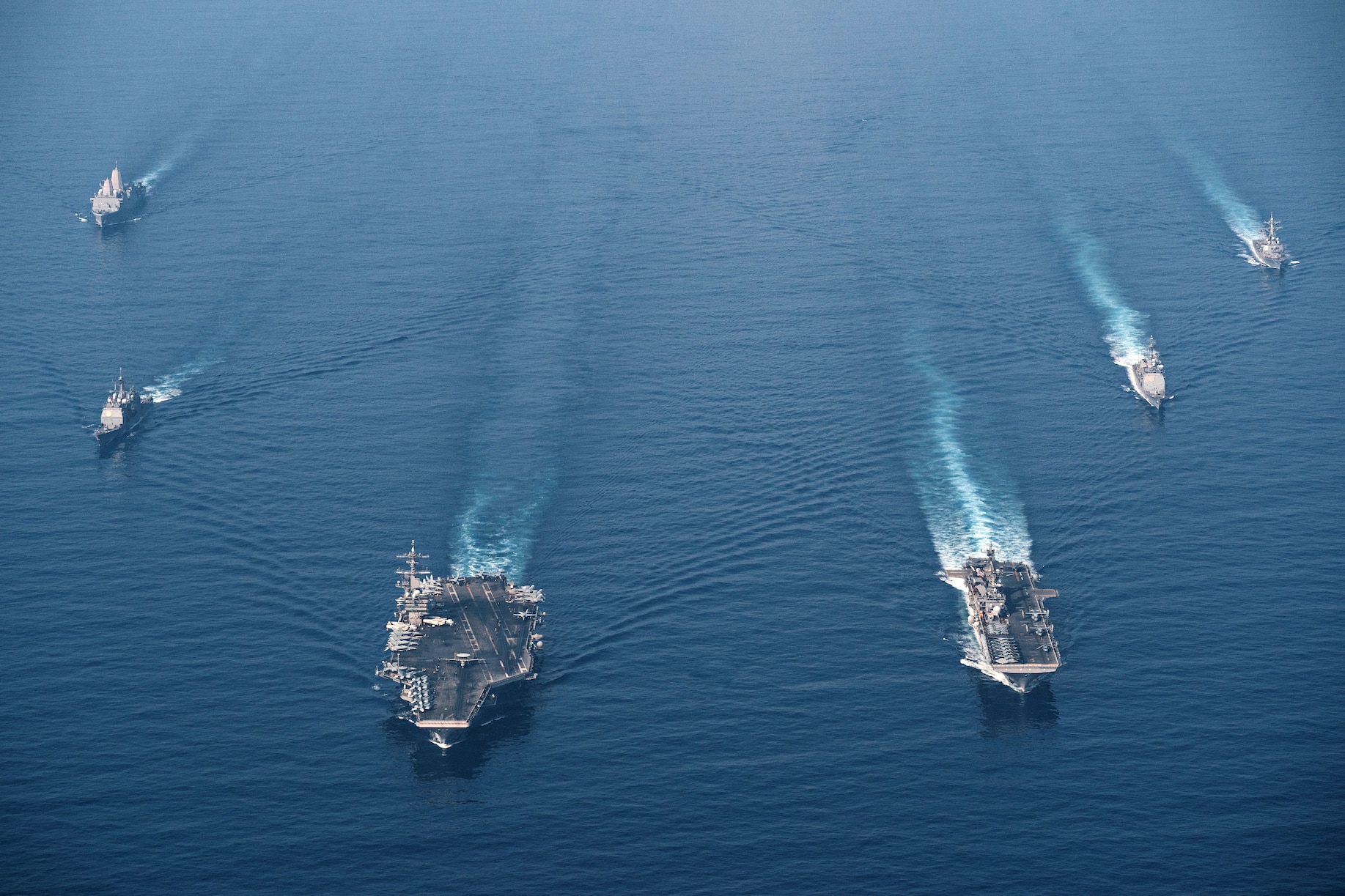 SOUTH CHINA SEA (April 9, 2021) The Theodore Roosevelt Carrier Strike Group transits in formation with the Makin Island Amphibious Ready Group in the South China Sea, April 9, 2021. The Theodore Roosevelt Carrier Strike Group, Makin Island Amphibious Ready Group and the Ticonderoga-class guided-missile cruiser USS Port Royal (CG 73) are conducting expeditionary strike force operations during their deployments to the U.S. 7th Fleet area of operations. As the U.S. Navy's largest forward-deployed fleet, 7th Fleet routinely operates and interacts with 35 maritime nations while conducting missions to preserve and protect a free and open Indo-Pacific region. (U.S. Navy photo by Mass Communication Specialist 3rd Class Terence Deleon Guerrero)